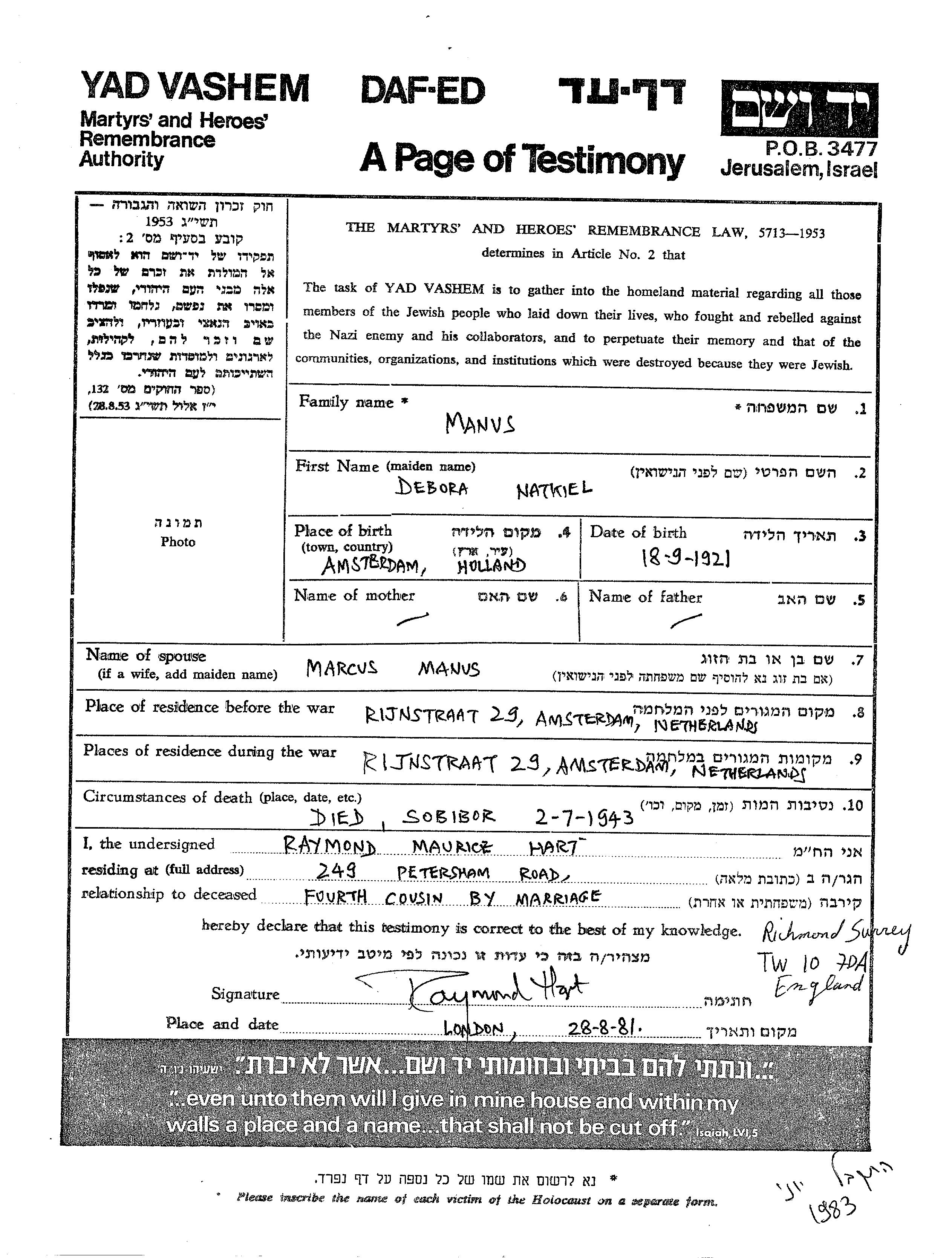 Natkiel Debora 1921 Amsterdam, Pays-Bas Feuille de témoignage