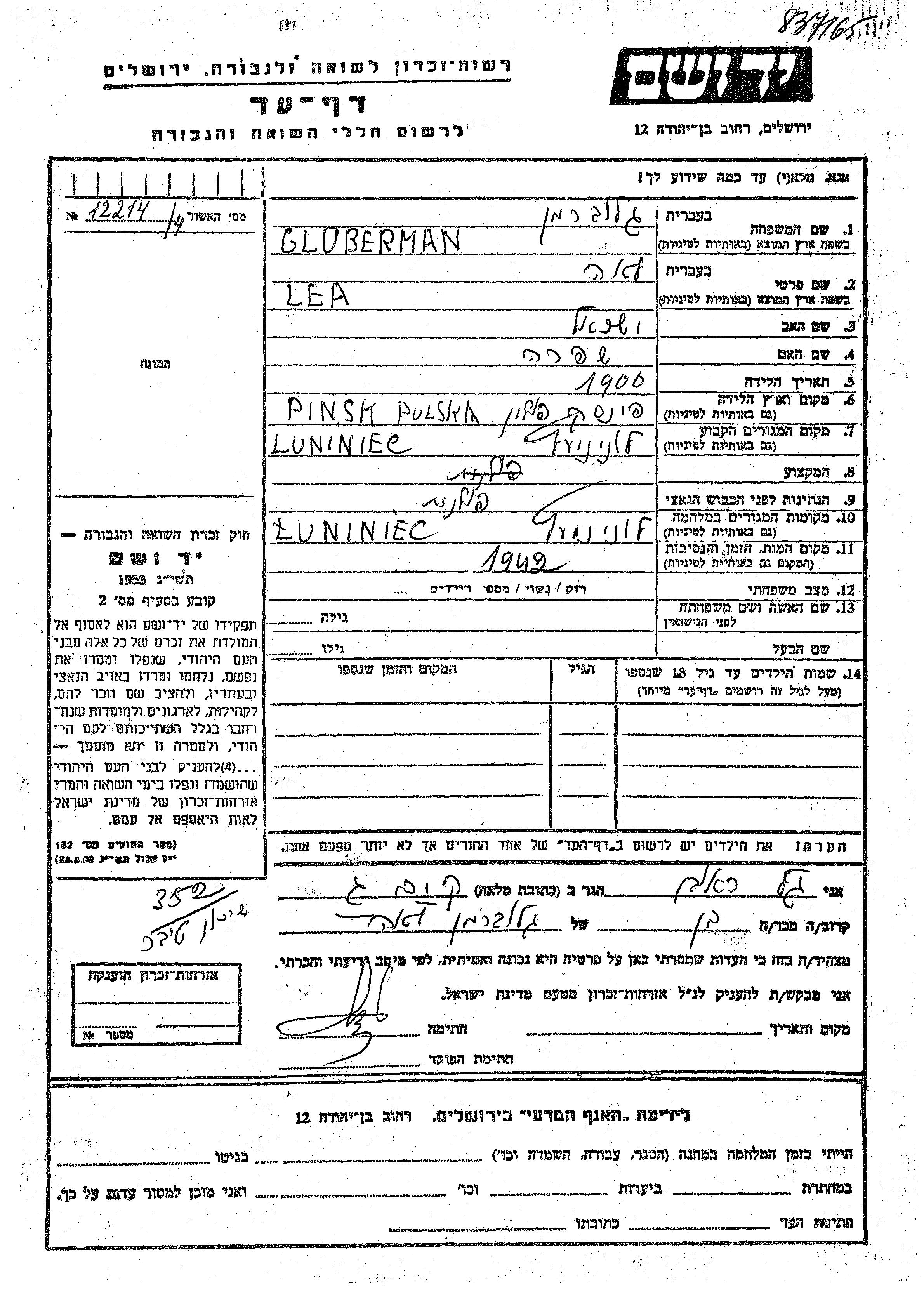 Globerman Lea 1900 Luniniec, Pologne Feuille de témoignage