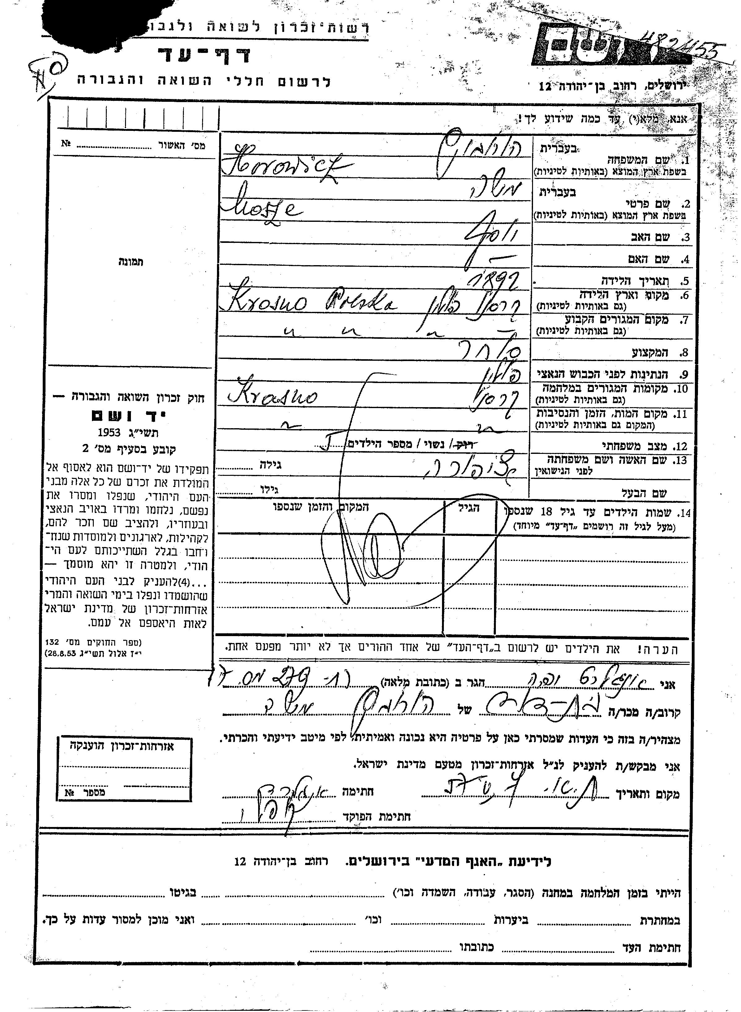 Horowicz Mosze 1892 Krosno, Pologne Feuille de témoignage