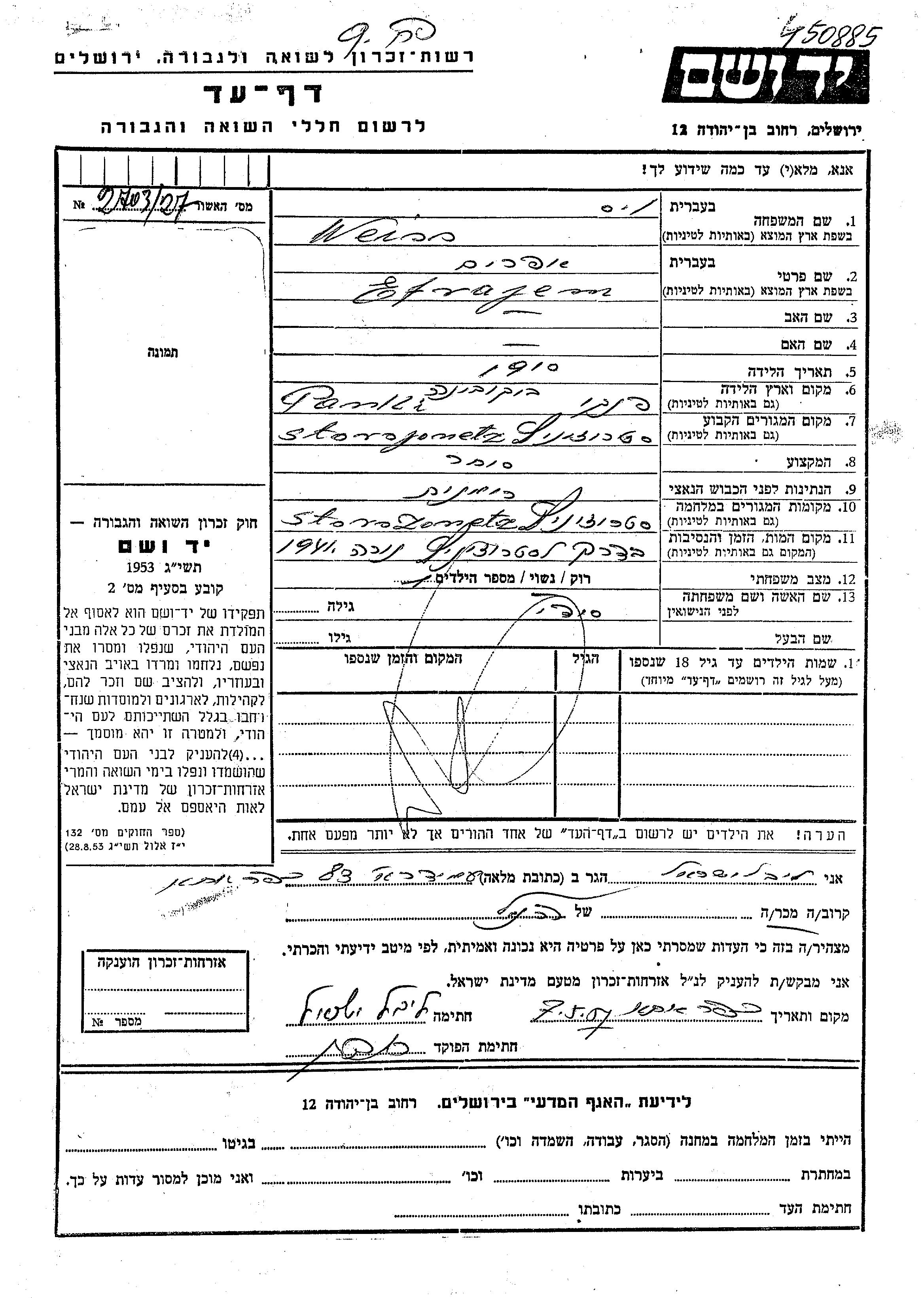 Weiss Efrajem 1910 Storozonetz, Roumanie Feuille de témoignage