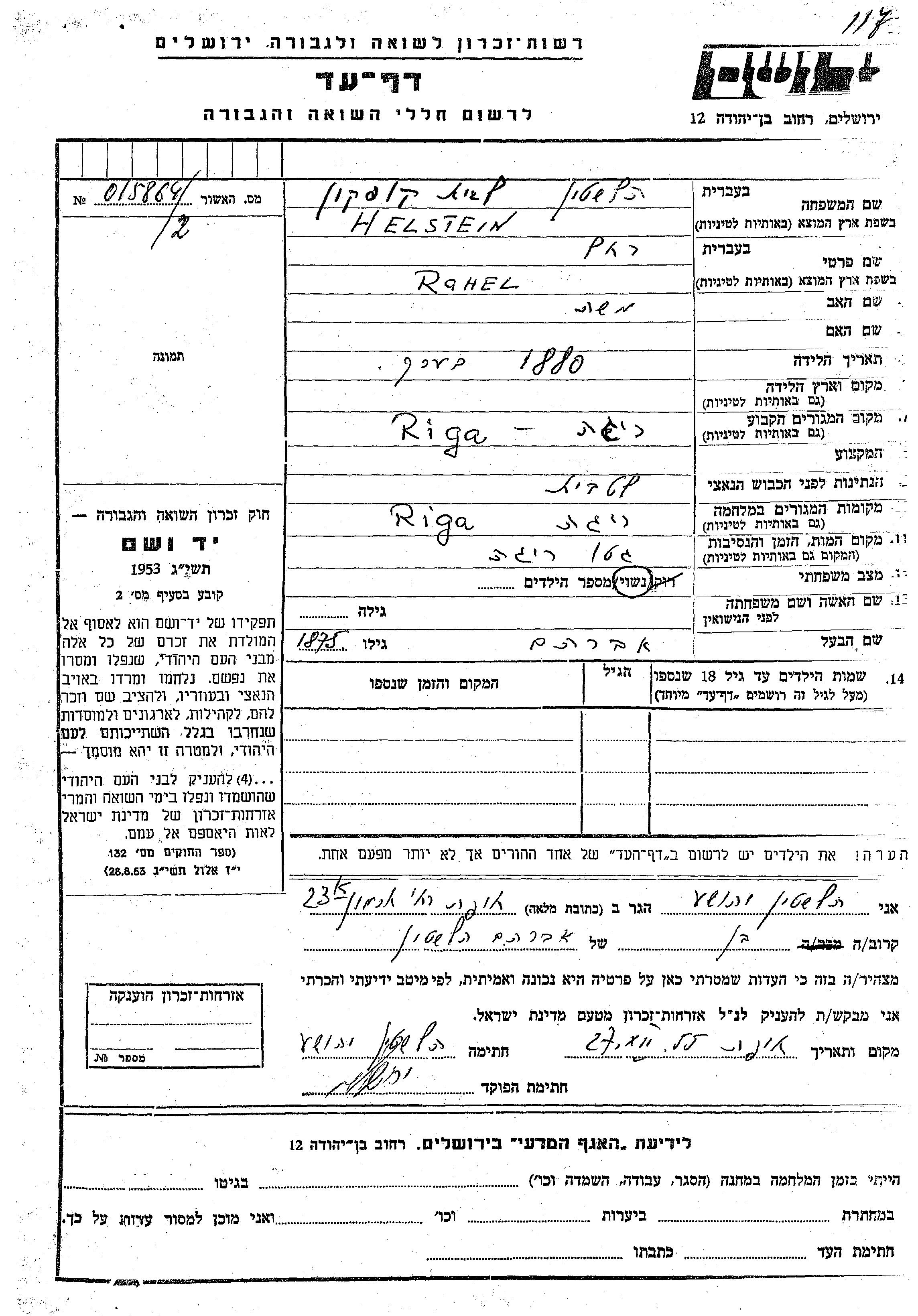 Rahel Helstein née Kofkin est née en 1880, fille de Moshe. Elle était Mariée à Avraham. Avant la seconde guerre mondiale elle vivait à Riga, Lettonie. Pendant la guerre, elle était à Riga, Lettonie.