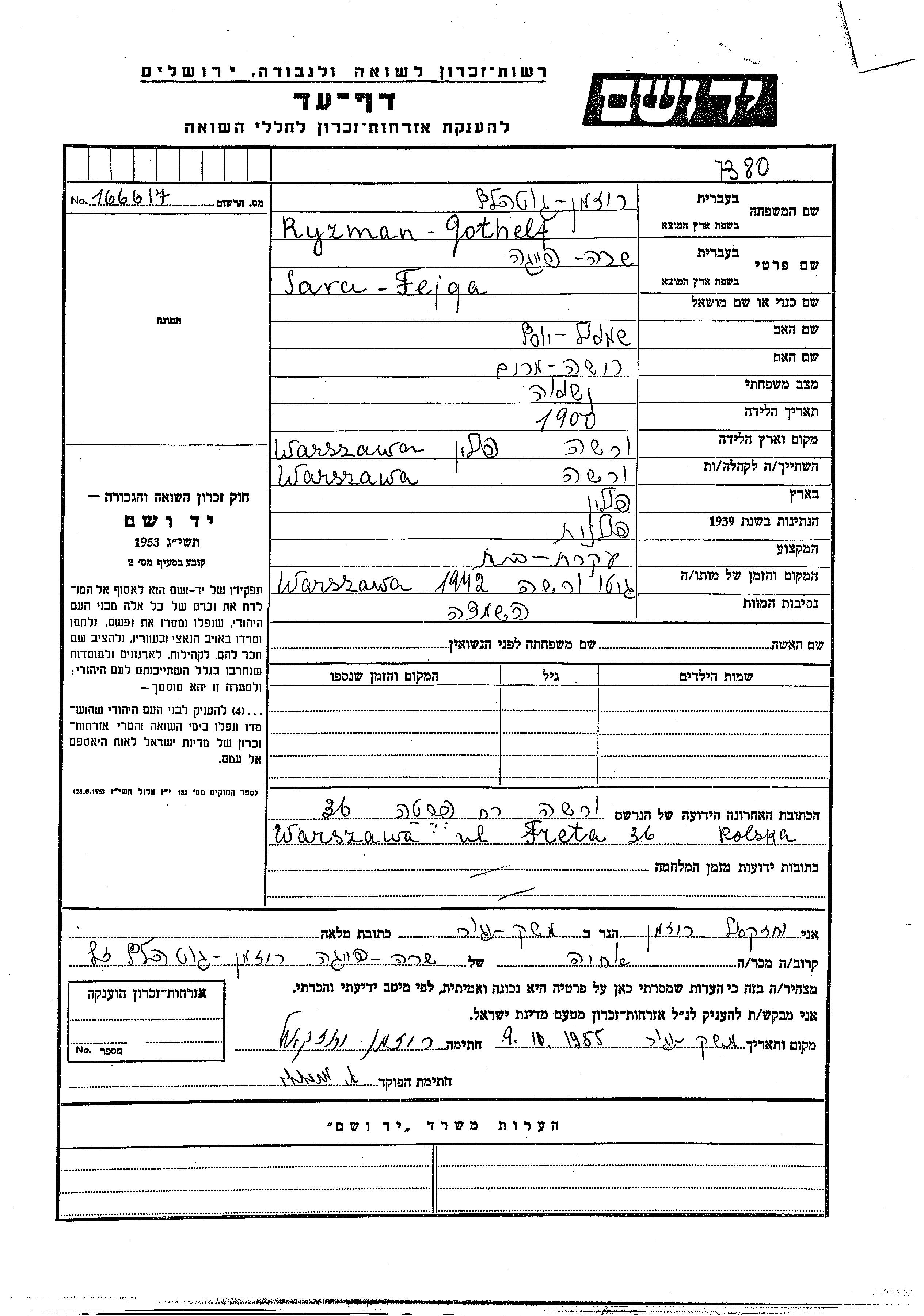 Fejga Sara Gothelf née Ryzman est née à Warszawa, Pologne en 1900, fille de Shmuel Yosef et de Rosha Miriam. Elle était Femme au foyer et Mariée. Avant la seconde guerre mondiale elle vivait à Warszawa, Pologne.