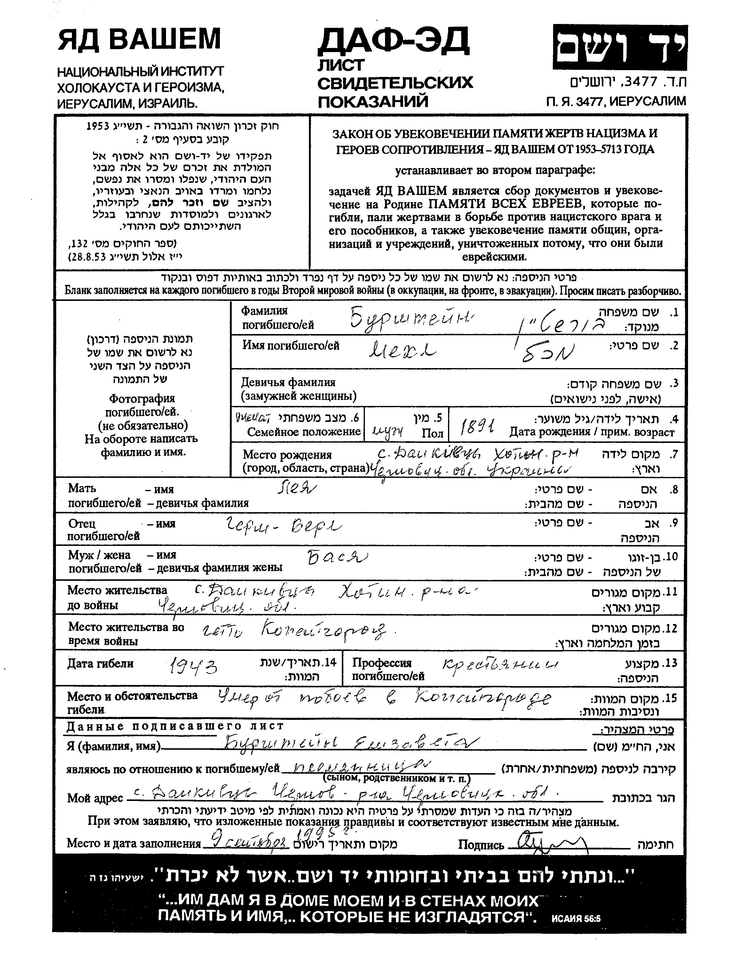 Burshtein Mekhl 1891 Dankovtsy, Roumanie Feuille de témoignage