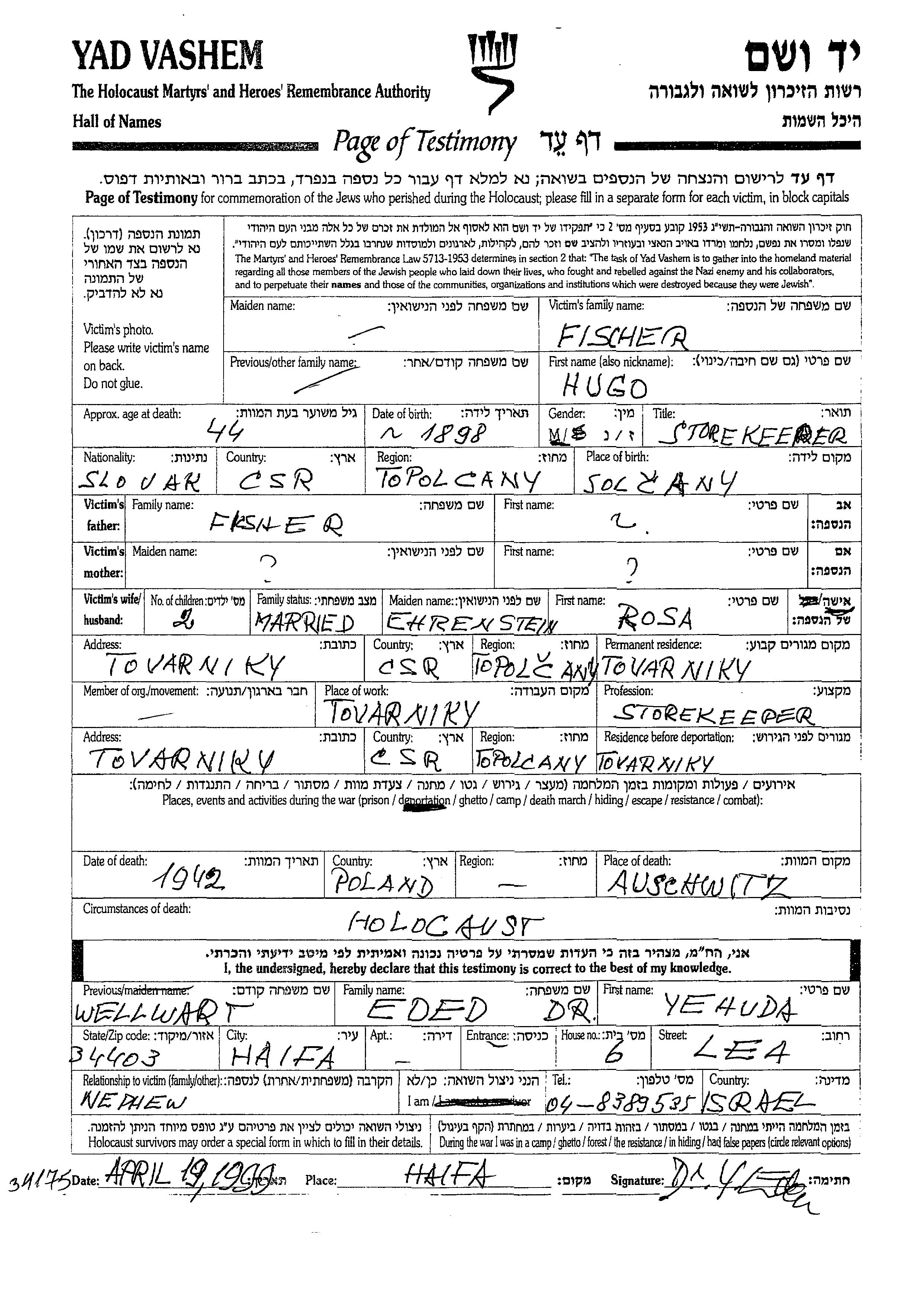 Fischer Hugo 1898 Tovarniky, Tchécoslovaquie Feuille de témoignage