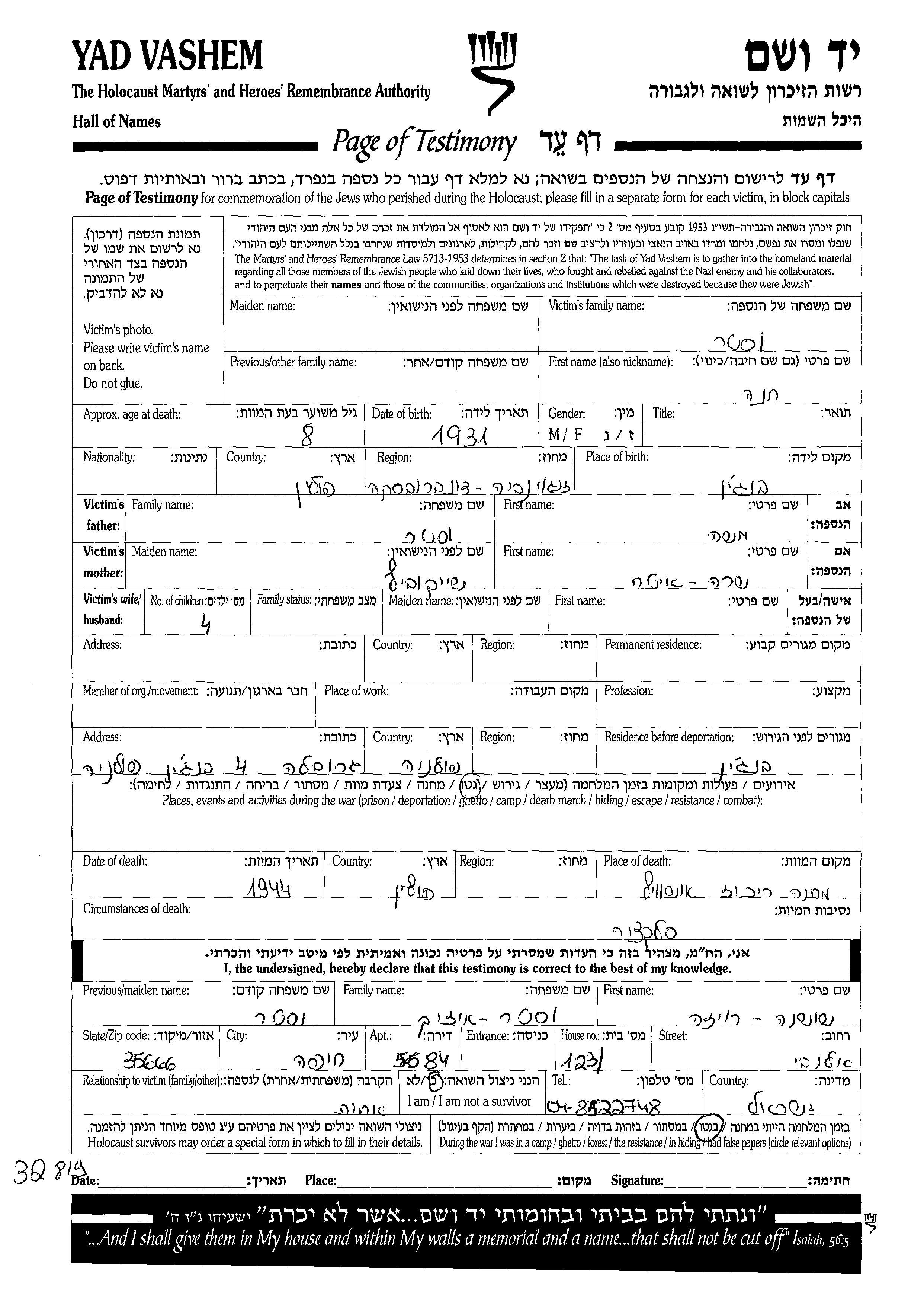 Yad Vashem - Pages of Testimony Names Memorial Collection