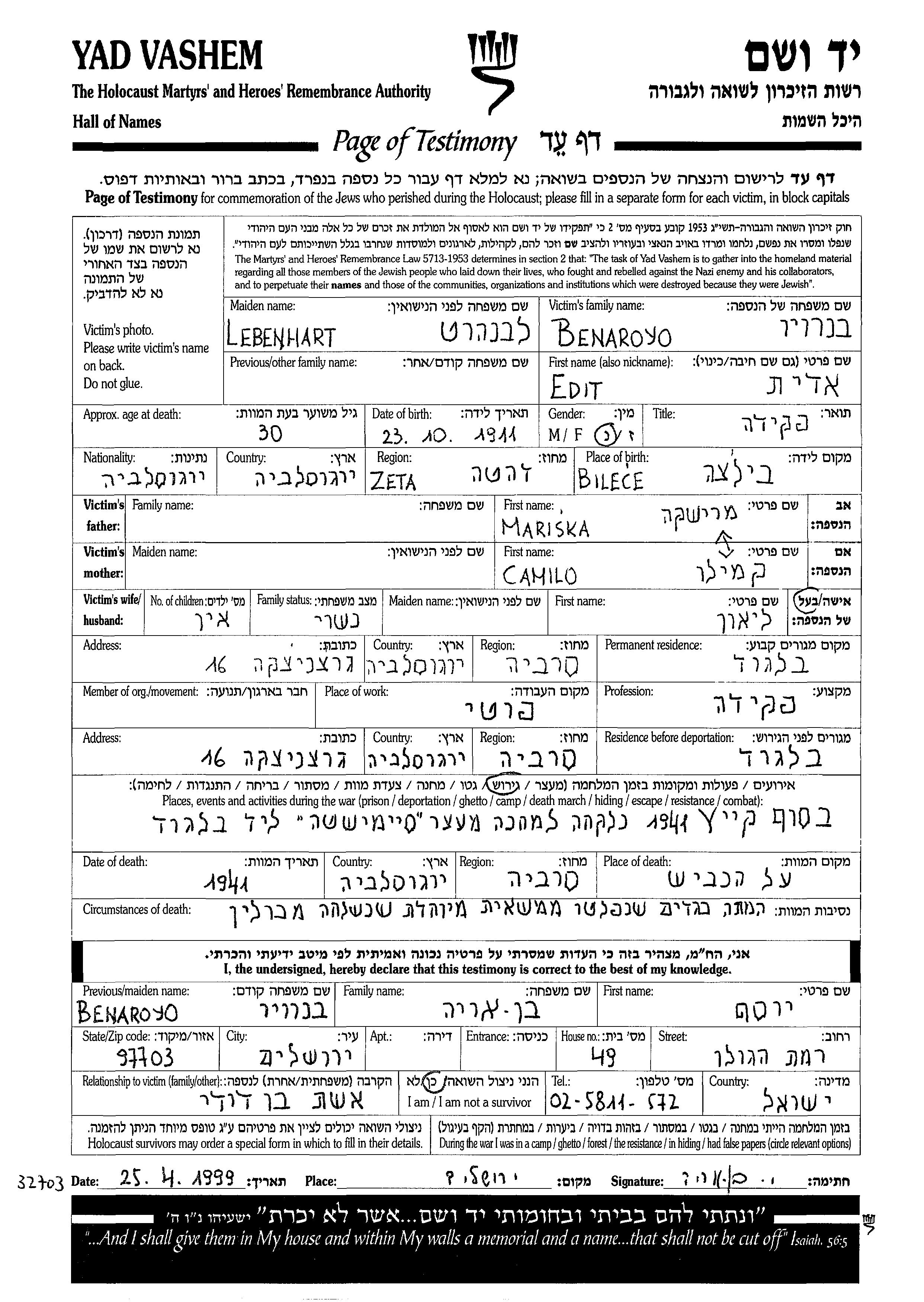 Yad Vashem - Pages of Testimony Names Memorial Collection