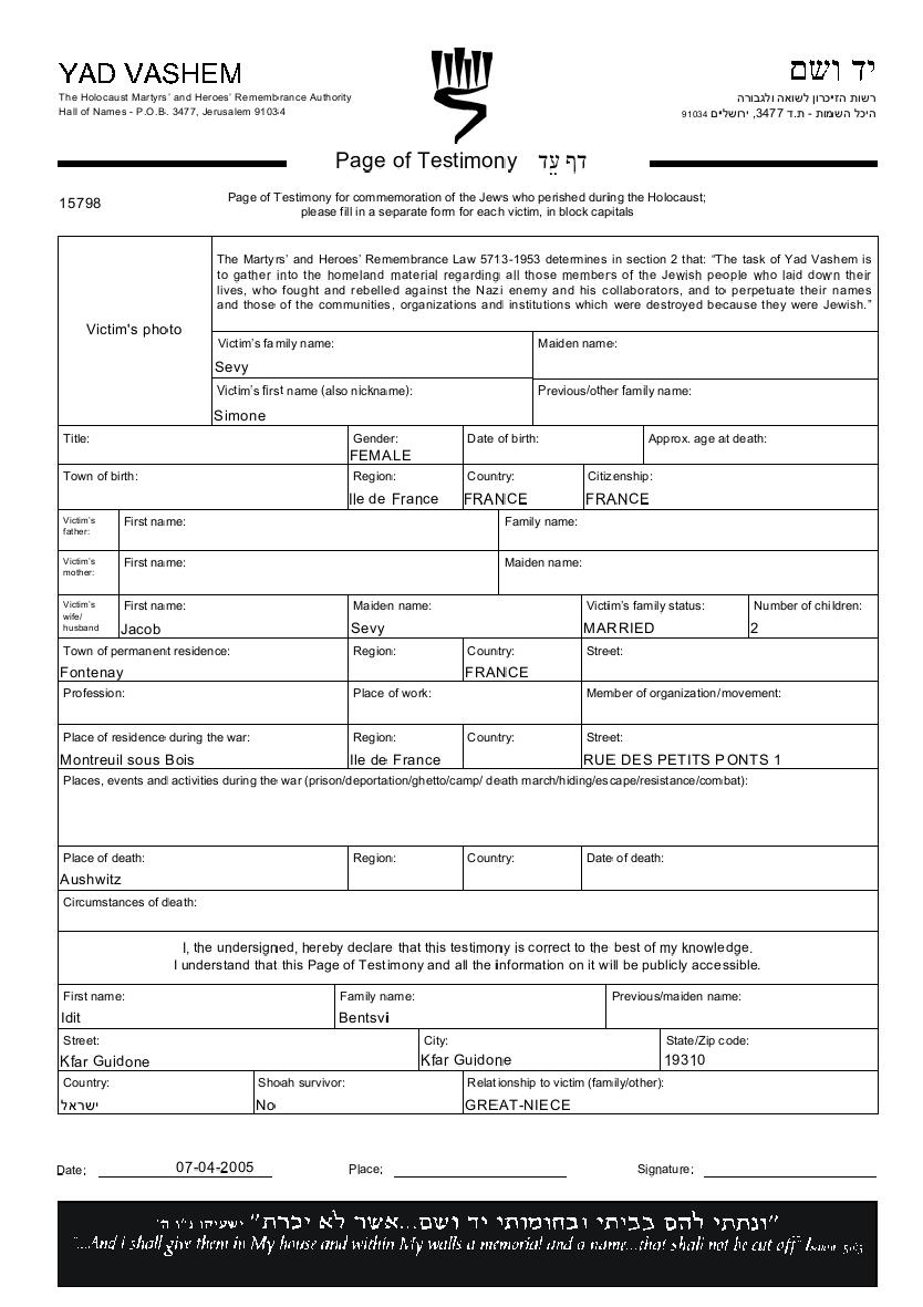 Simone Sevy est née à Seine, France. Elle était Mariée à Jacob née Sevy. Avant la seconde guerre mondiale elle vivait à Fontenay, France. Pendant la guerre, elle était à Montreuil sous Bois, France.