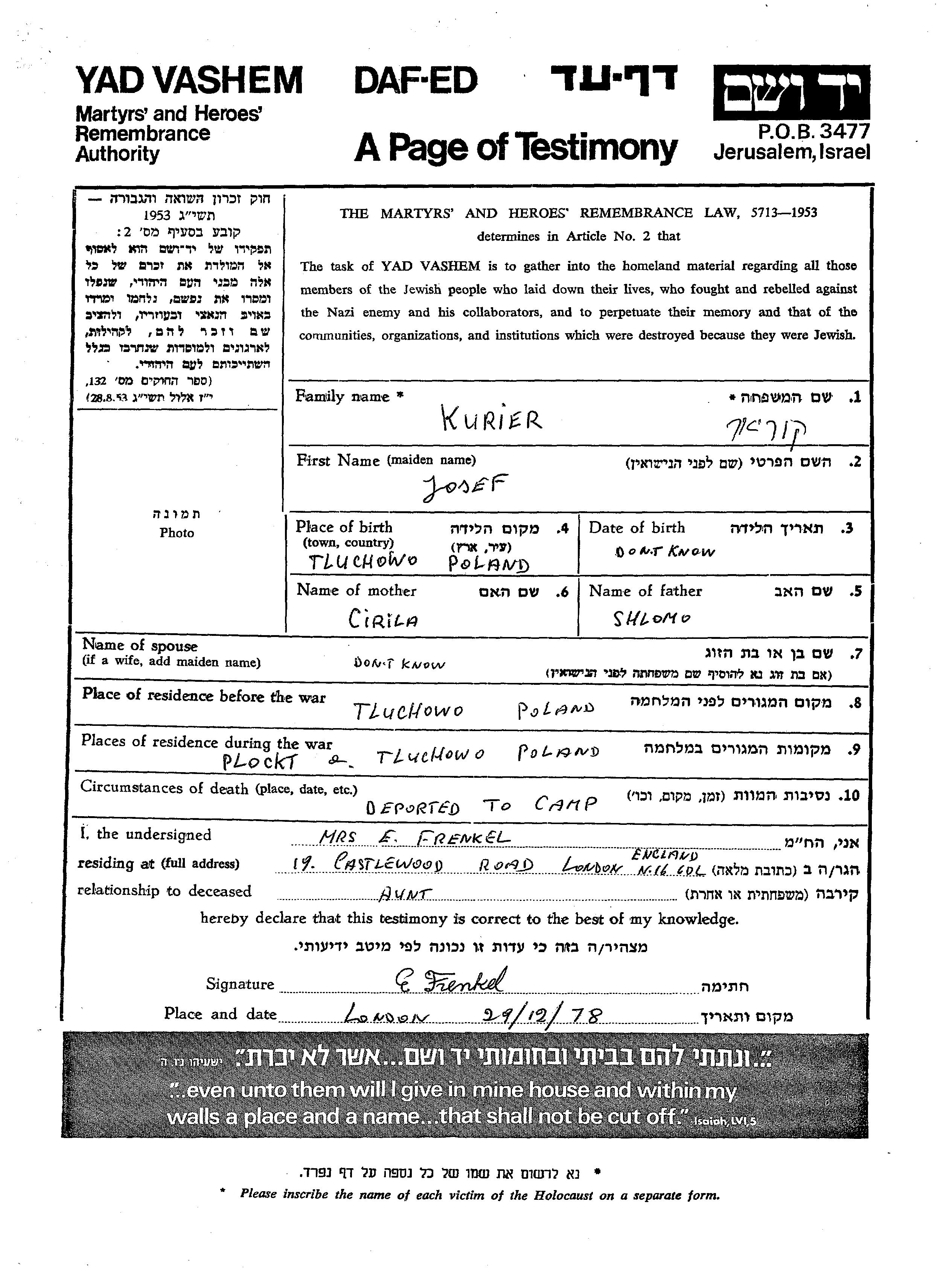 Josef Kurier est né à Tluchowo, Pologne, fils de Shlomo et de Cirila. Avant la seconde guerre mondiale il vivait à Tluchowo, Pologne. Au cours de la guerre, il était à Plock, Pologne.
