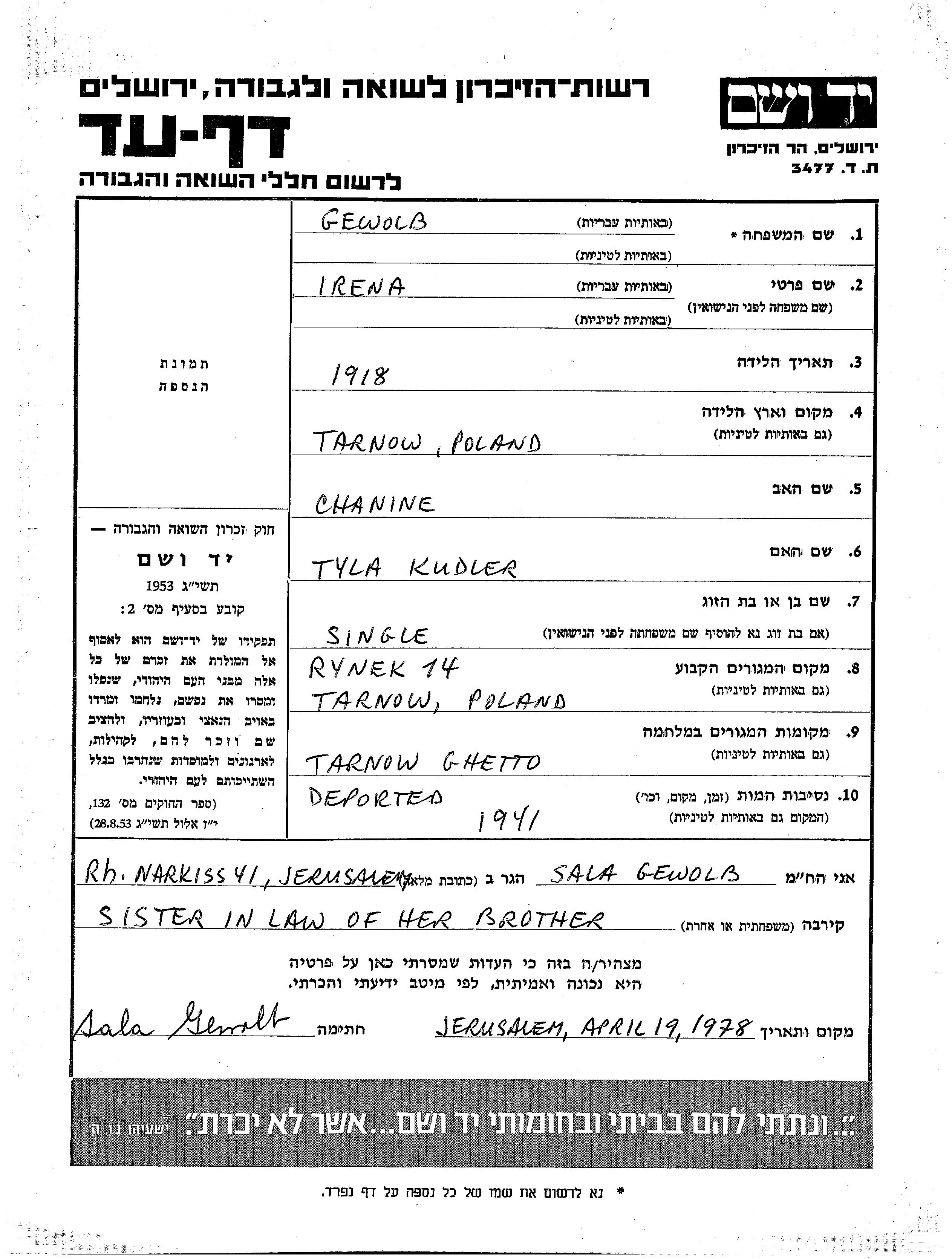 Irena Gewolb est née à Tarnow, Pologne en 1918, fille de Chanine et de Tyla. Elle était Célibataire. Avant la seconde guerre mondiale elle vivait à Tarnow, Pologne. Pendant la guerre, elle était à Tarnow, Pologne.