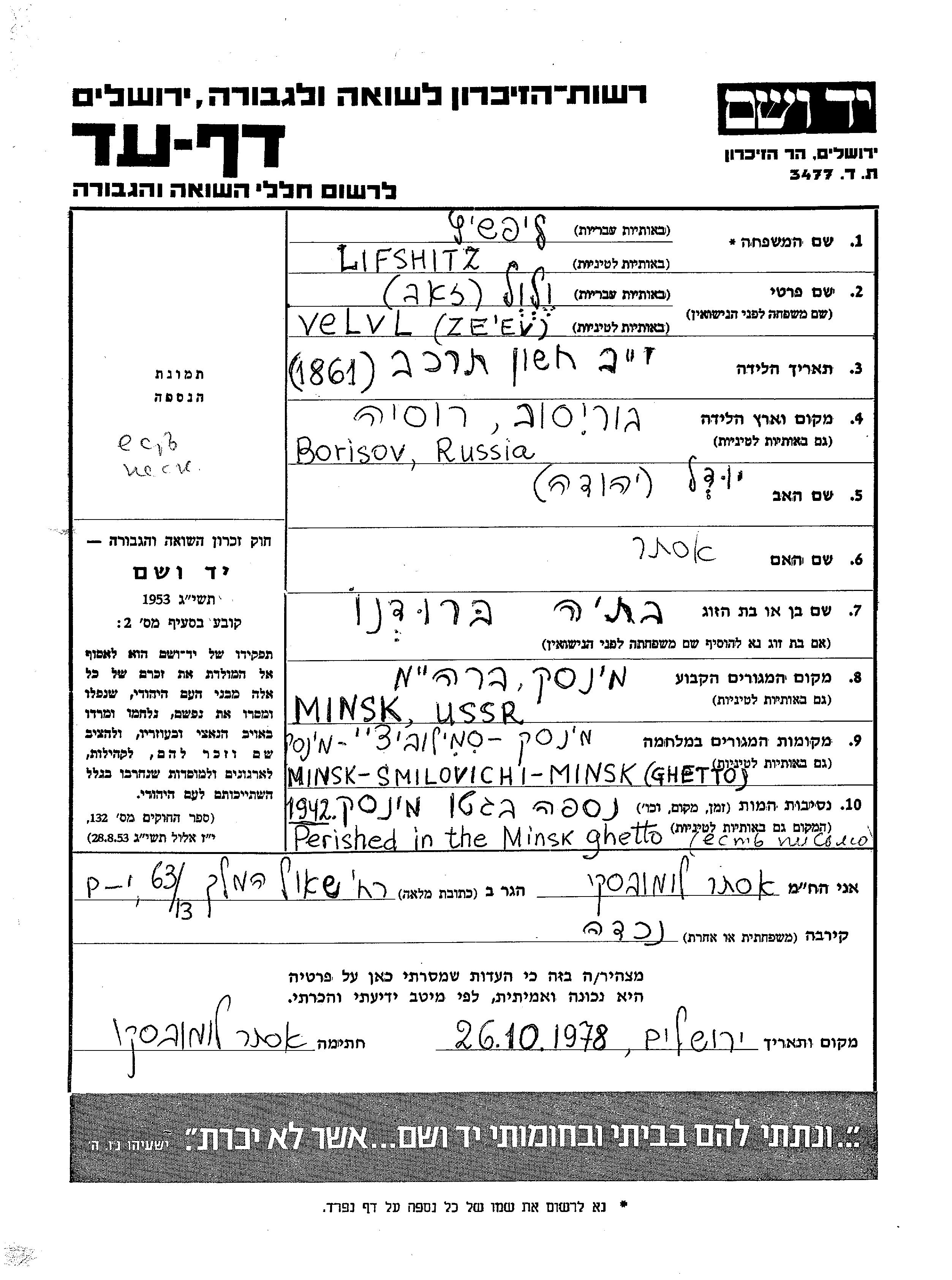 Lifshitz Velvl Zeev 1861 Minsk, Bélorussie (URSS) Feuille de témoignage