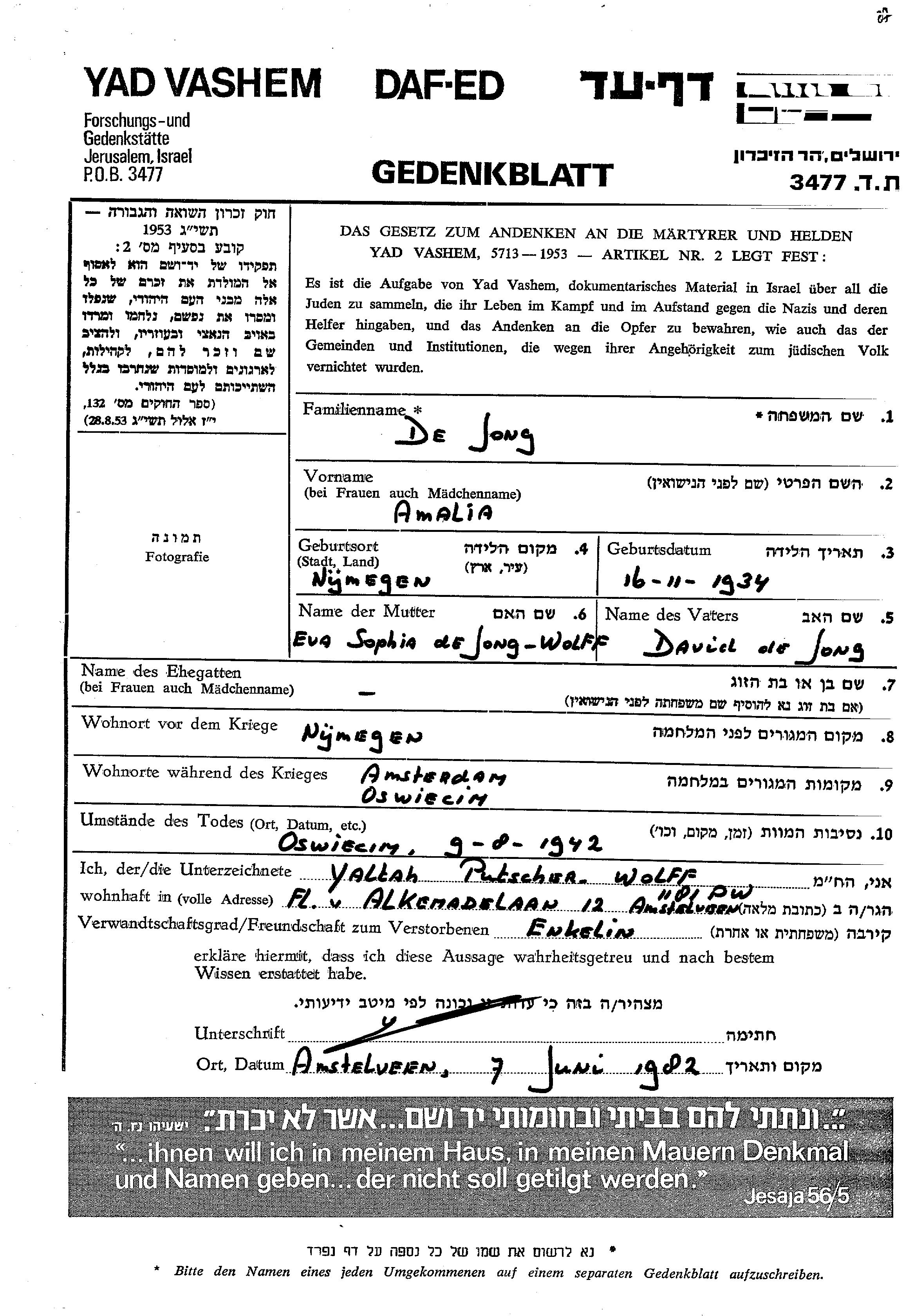 Amalia Jong de est née à Nymegen, Pays-Bas en 1934, fille de David et de Eva Sophia. Avant la seconde guerre mondiale elle vivait à Nymegen, Pays-Bas. Pendant la guerre, elle était à Nymegen, Pays-Bas.