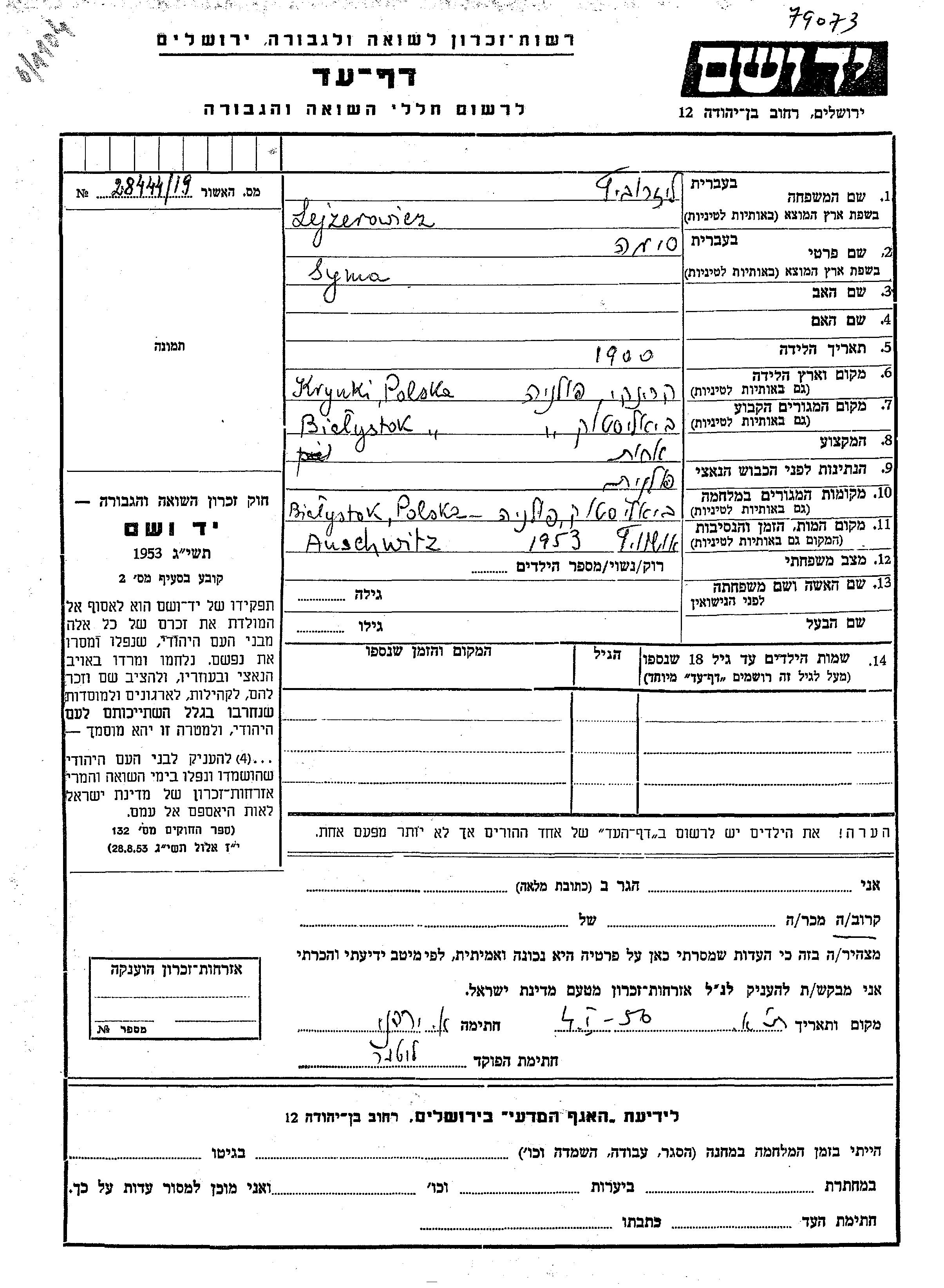 Lejzerowicz Syma 1900 Bialystok, Pologne Feuille de témoignage