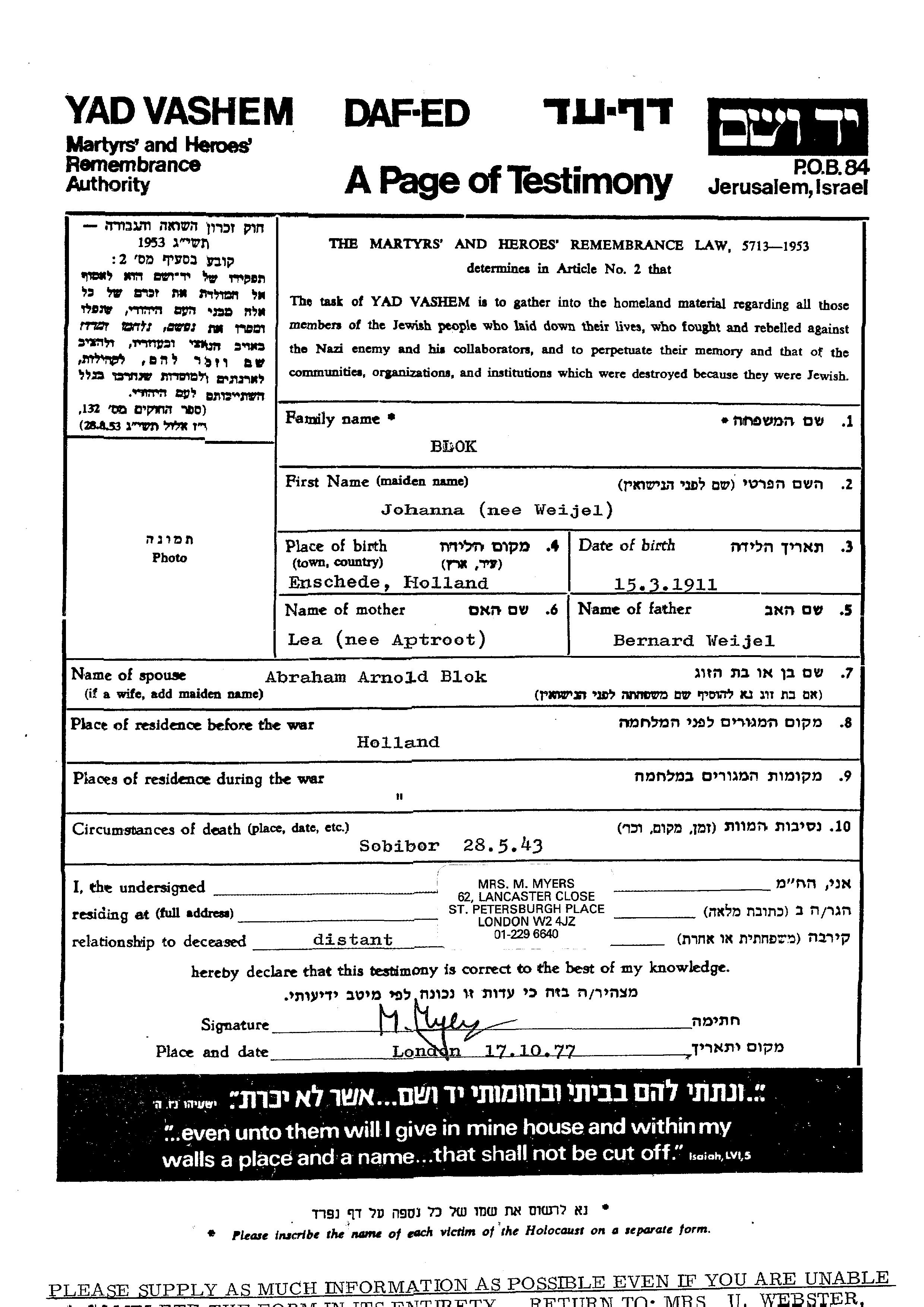 Johanna Blok née Weijel est née à Enschede, Pays-Bas en 1911, fille de Bernard et de Lea. Elle était Mariée à Abraham Arnold. Avant la seconde guerre mondiale elle vivait à Pays-Bas. Pendant la guerre, elle était à Pays-Bas.