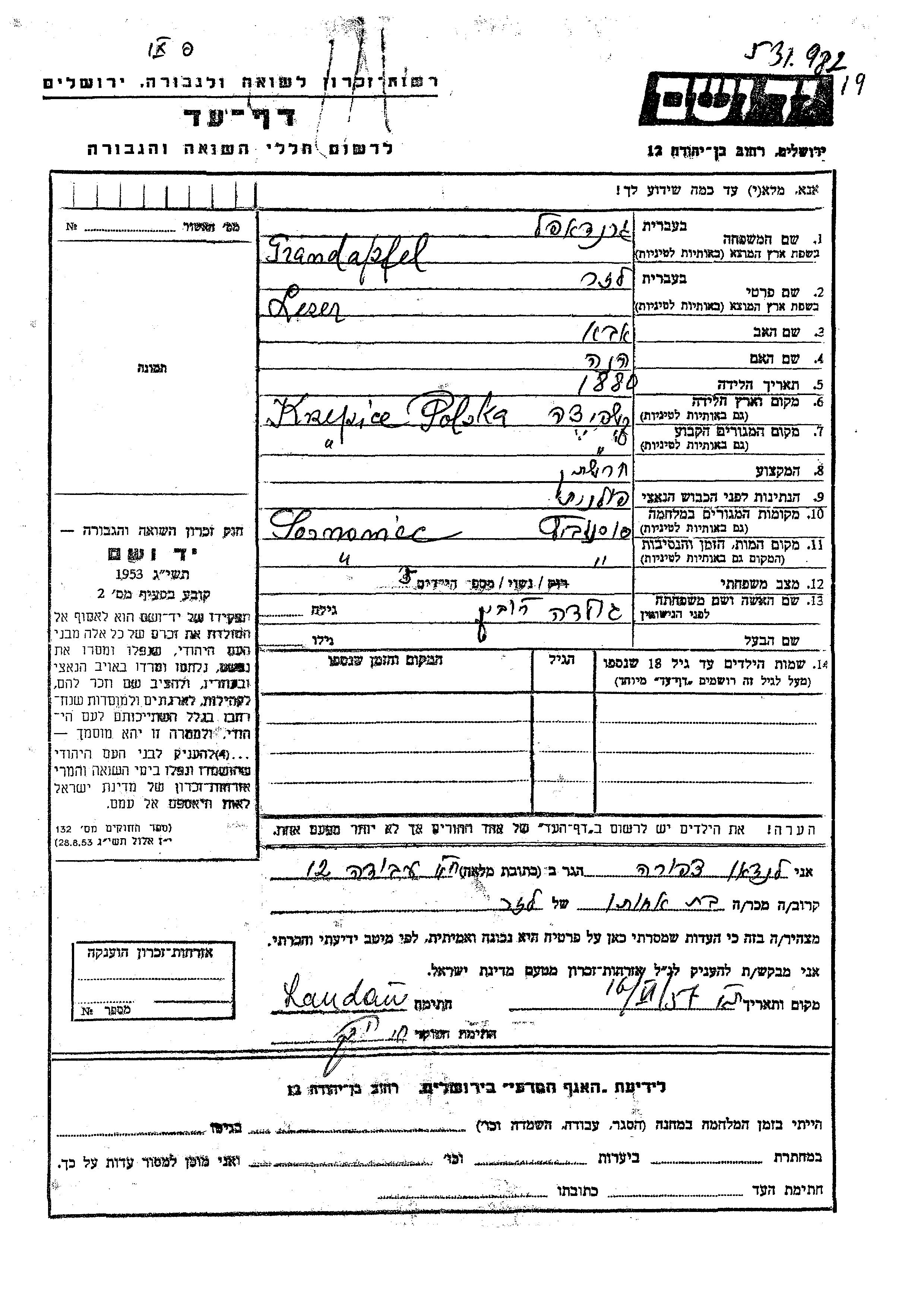 Yad Vashem - Pages of Testimony Names Memorial Collection