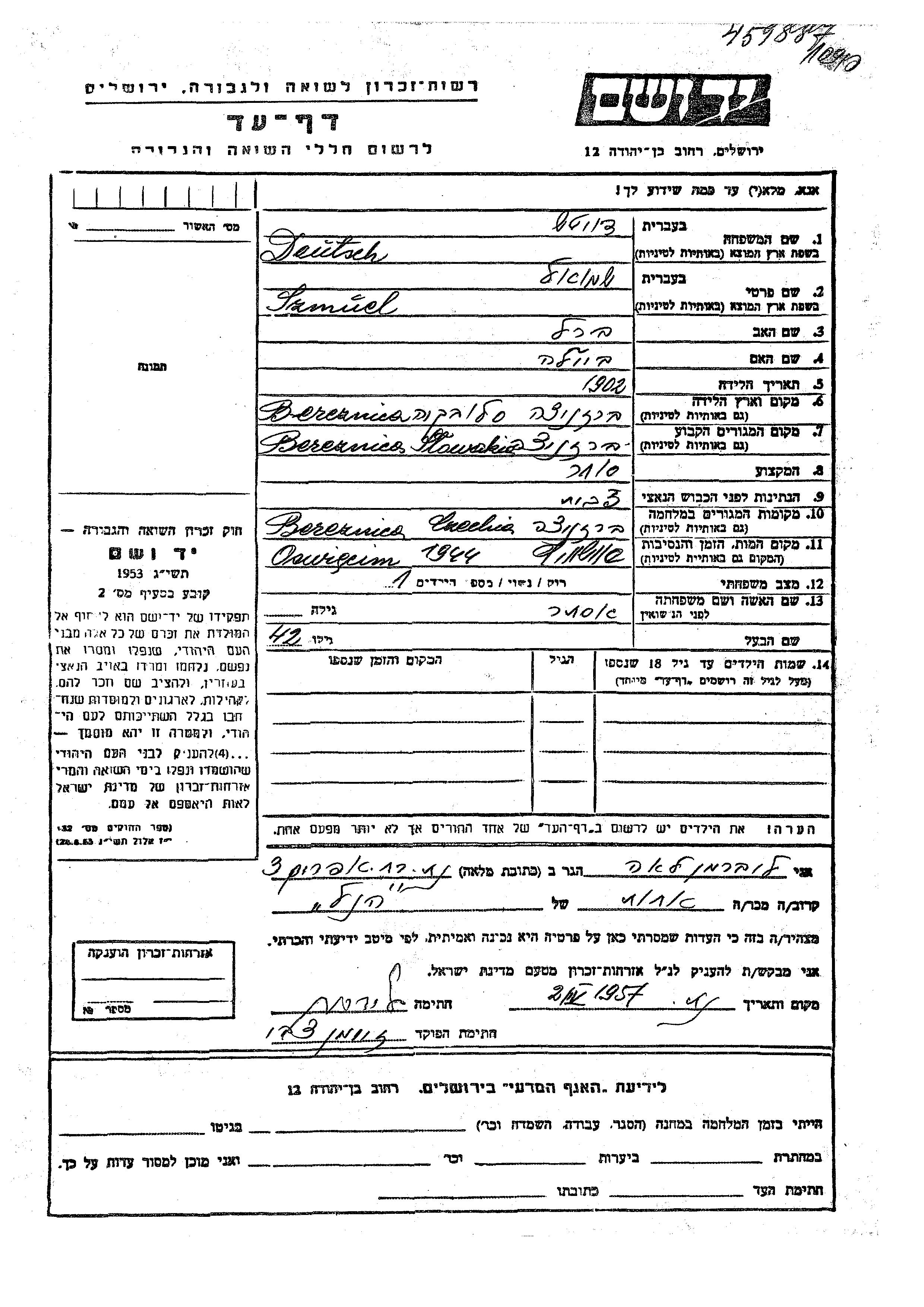 Deutsch Szmuel 1902 Breznica, Tchécoslovaquie Feuille de témoignage