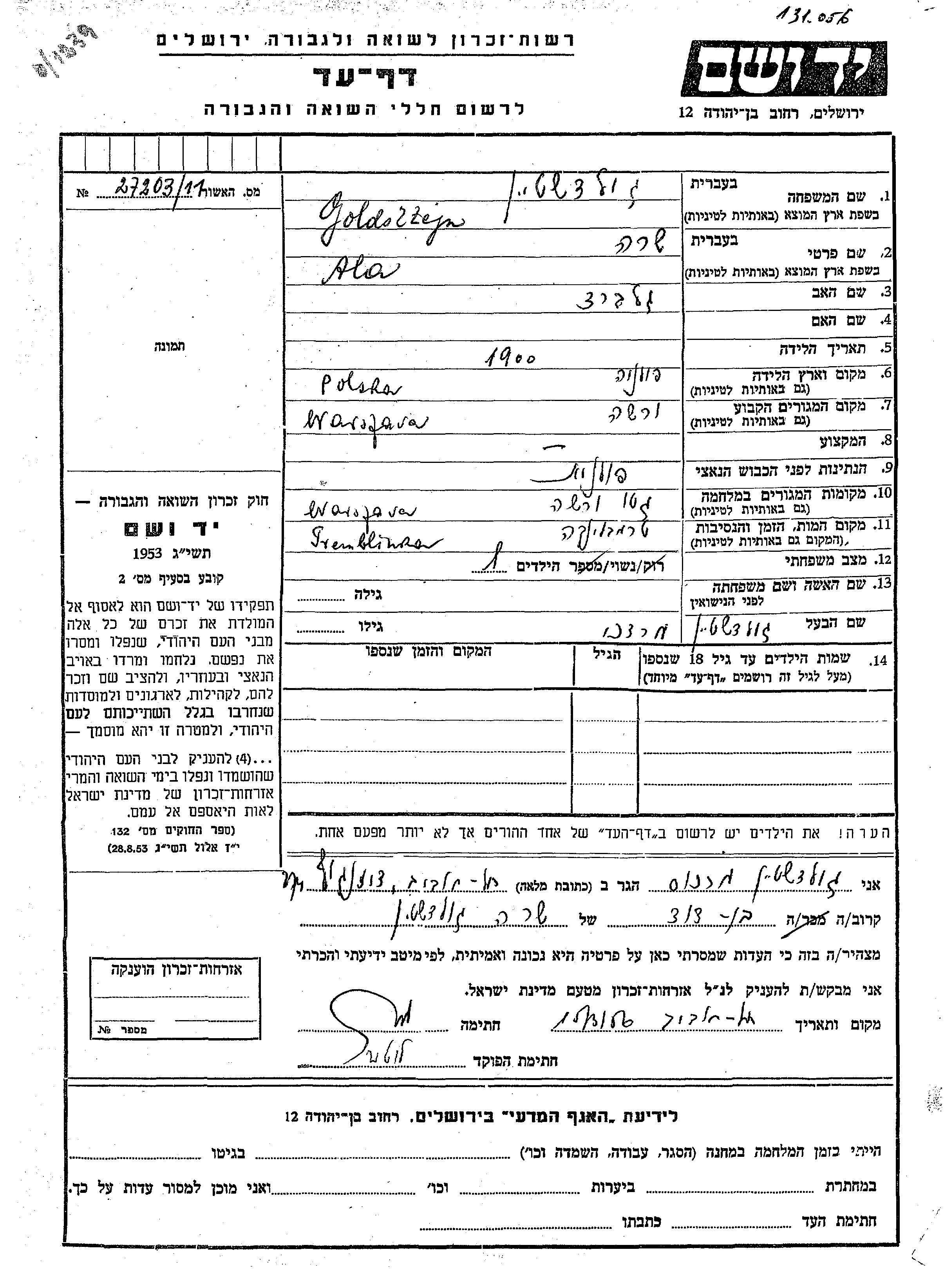 Goldsztejn Ela Sara 1900 Warszawa, Pologne Feuille de témoignage