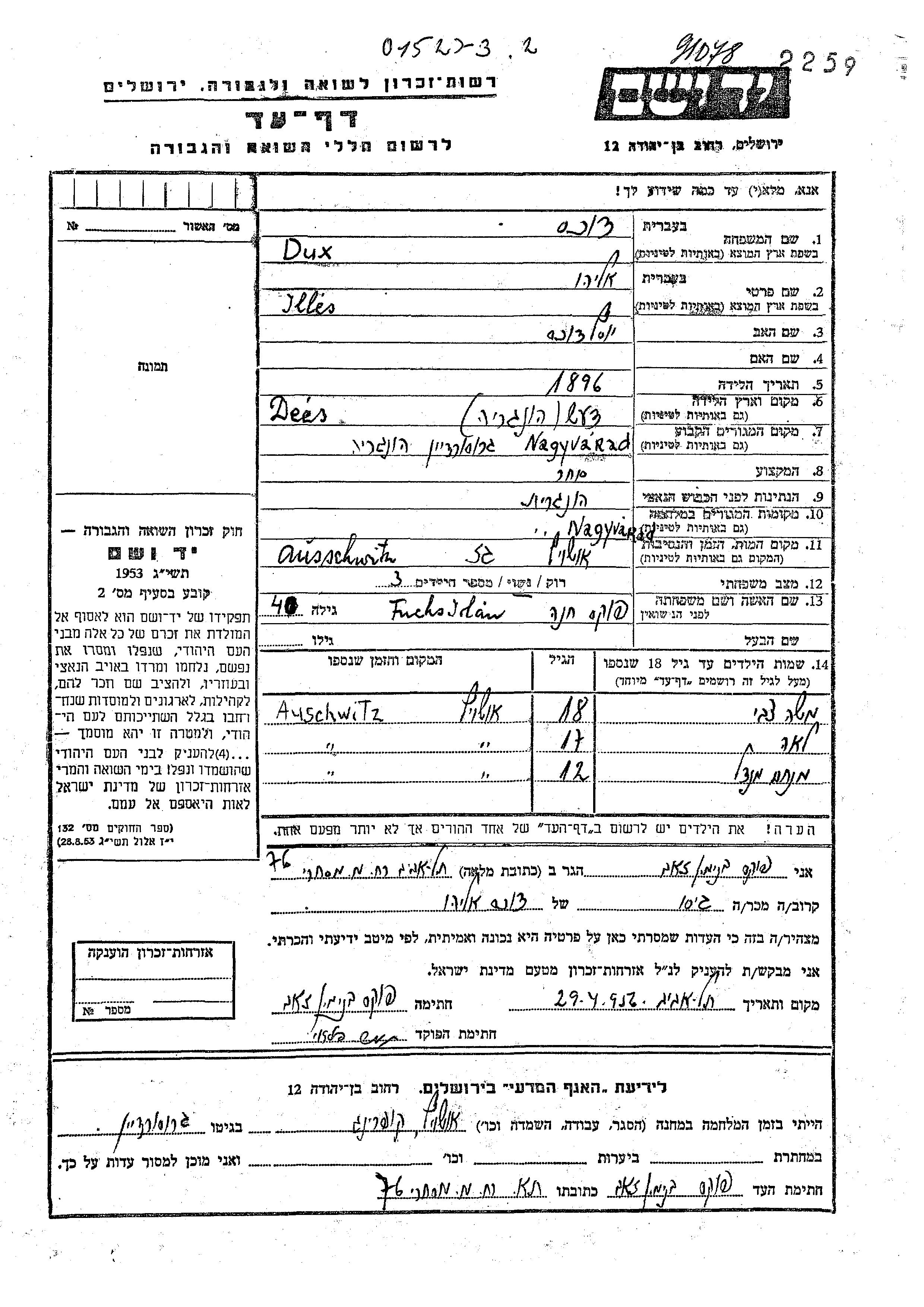Illes Dux est né à Decs, Hongrie en 1896, fils de Yosef. Il était Commerçant/e et Mariée à Khana née Fuchs. Avant la seconde guerre mondiale il vivait à Nagyvarad, Roumanie. Au cours de la guerre, il était à Nagyvarad, Roumanie.