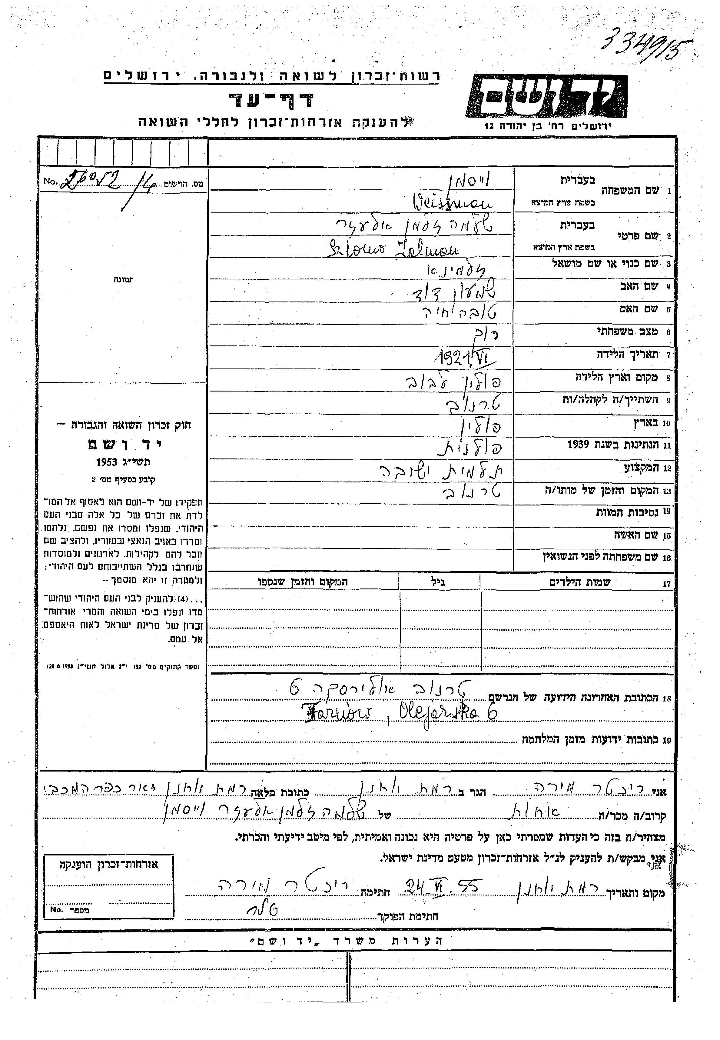 Veisman Szlomo Zalman Elazar 1921 Tarnow, Pologne Feuille de témoignage