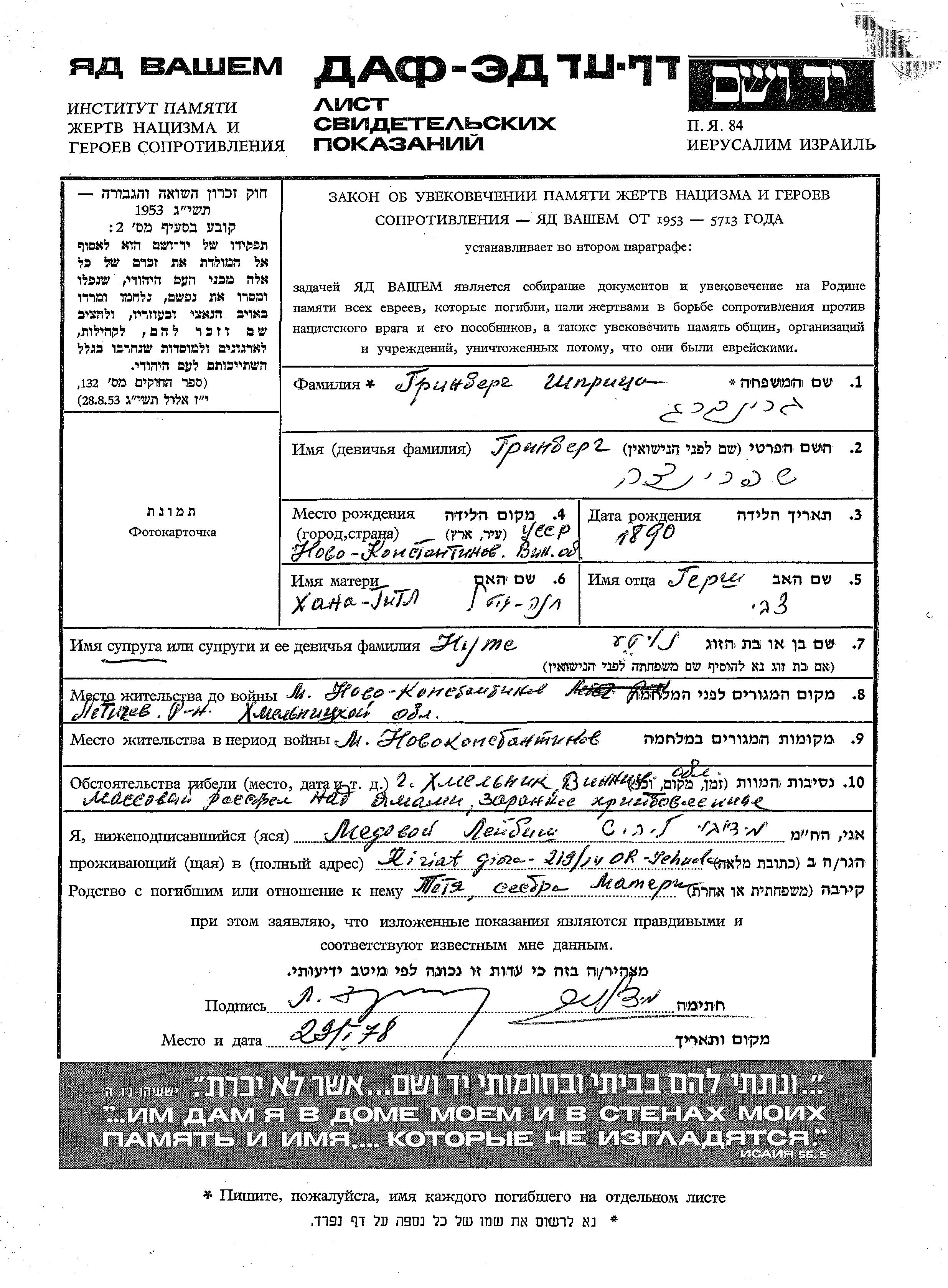 Grinberg Shprintza 1890 Novokonstantinov, Ukraine (URSS) Feuille de témoignage