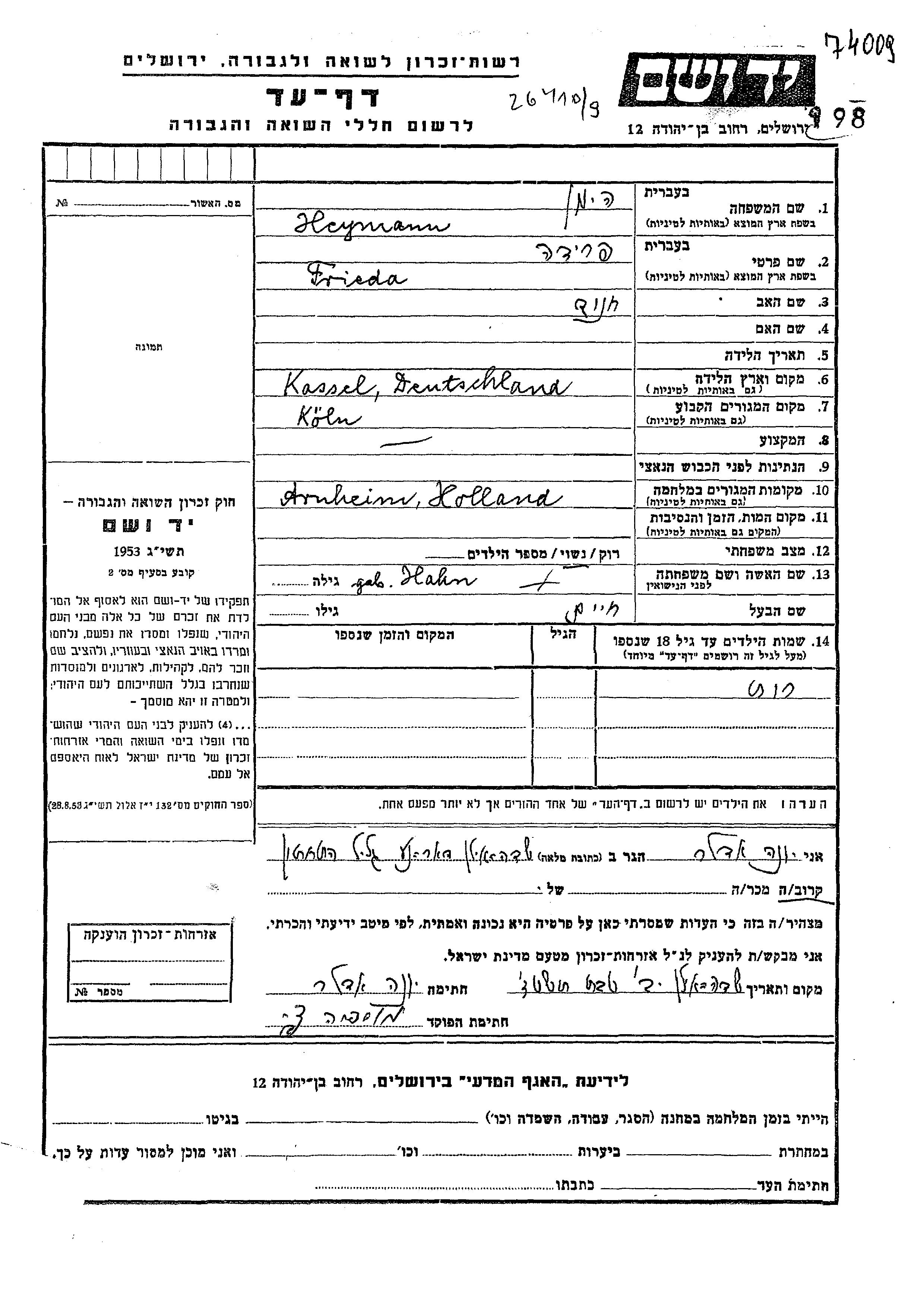 Heymann Frieda Koln, Allemagne Feuille de témoignage