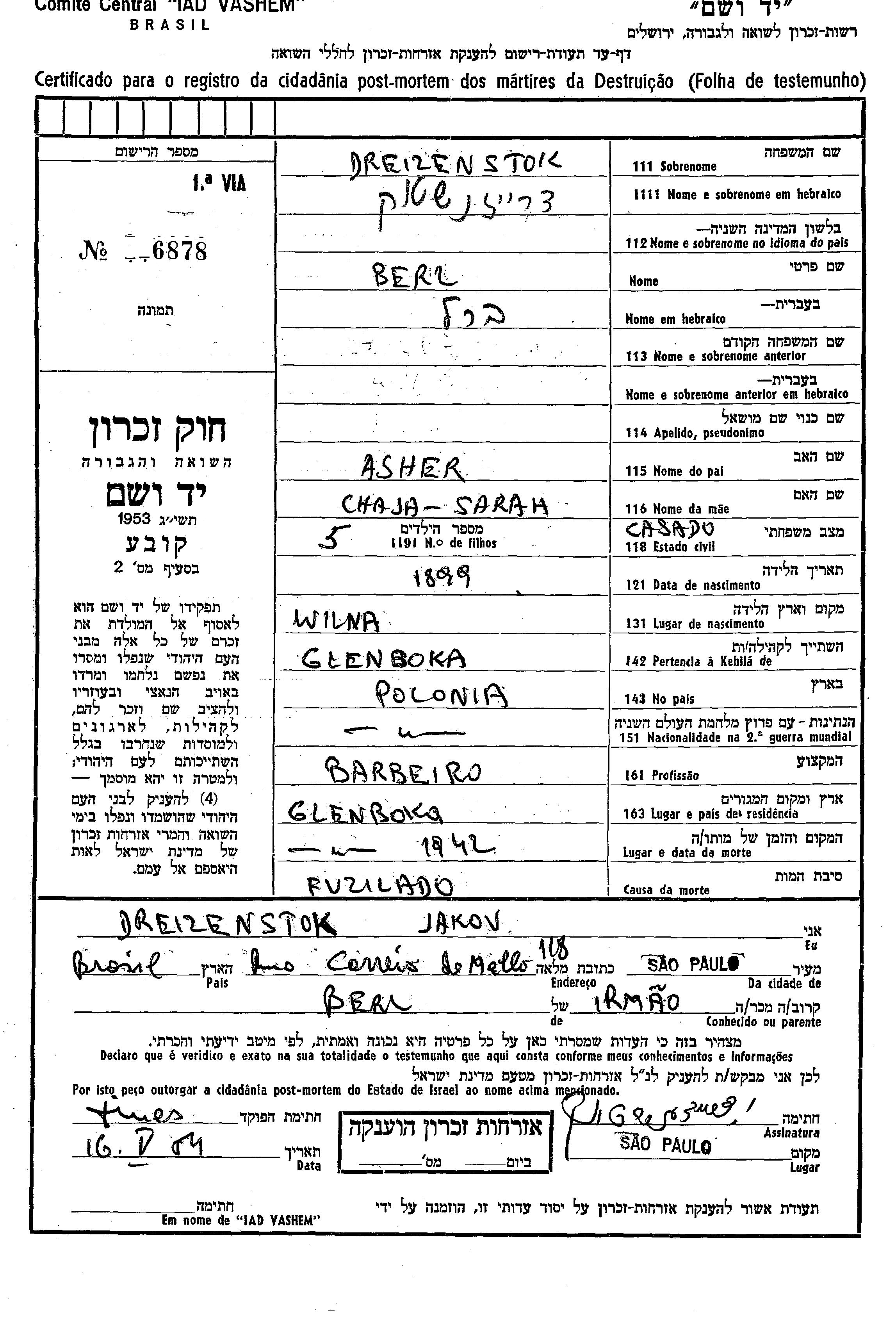 Dreizenstok Berl 1899 Glebokie, Pologne Feuille de témoignage