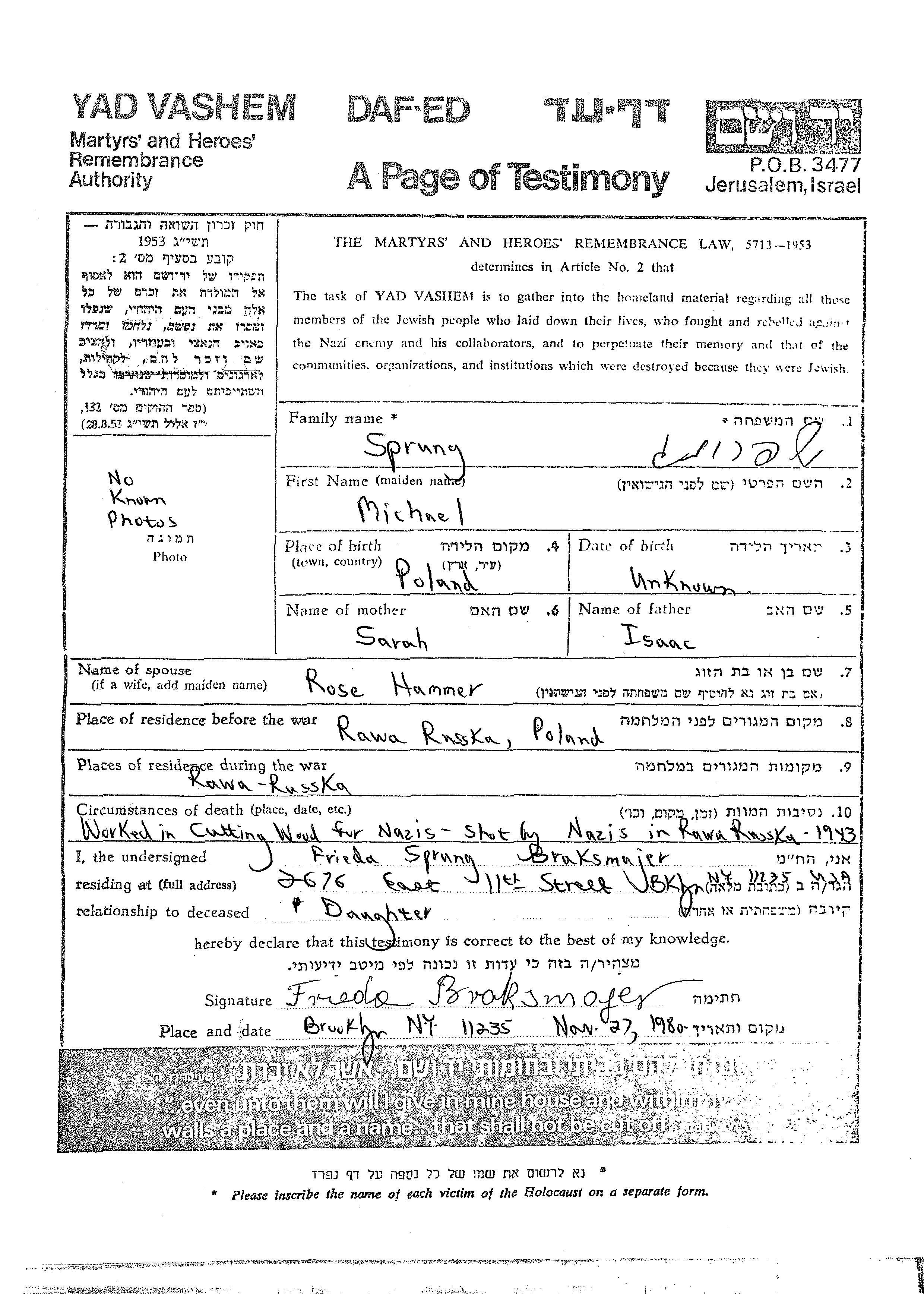 Michael Sprung est né à Pologne, fils de Isaac et de Sarah. Il était Mariée à Rose née Hammer. Avant la seconde guerre mondiale il vivait à Rawa Ruska, Pologne. Au cours de la guerre, il était à Rawa Ruska, Pologne.