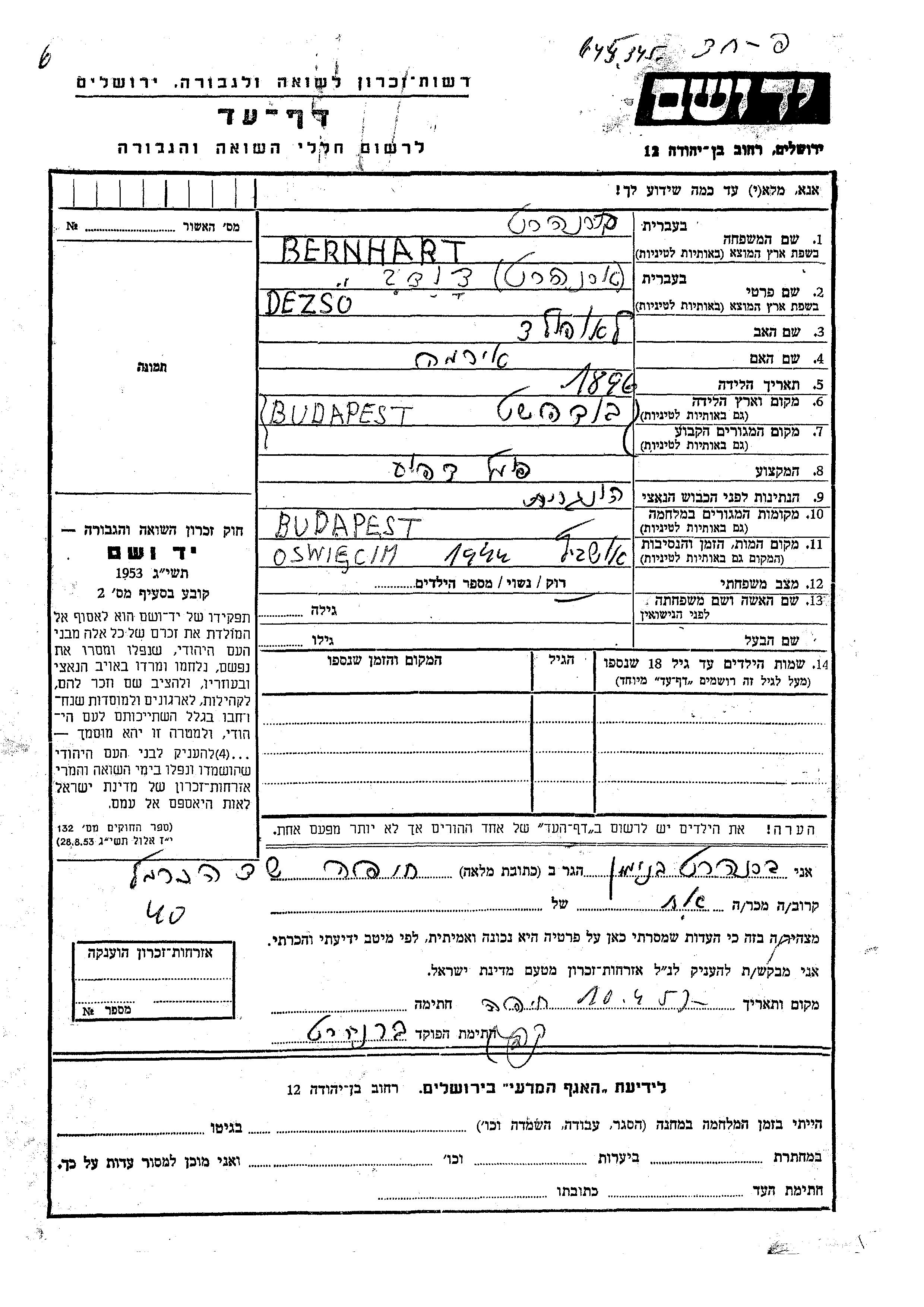 Dezso David Bernhart est né à Budapest, Hongrie en 1896, fils de Leopold et de Irma. Il était Imprimeur et Célibataire. Avant la seconde guerre mondiale il vivait à Budapest, Hongrie. Au cours de la guerre, il était à Budapest, Hongrie.