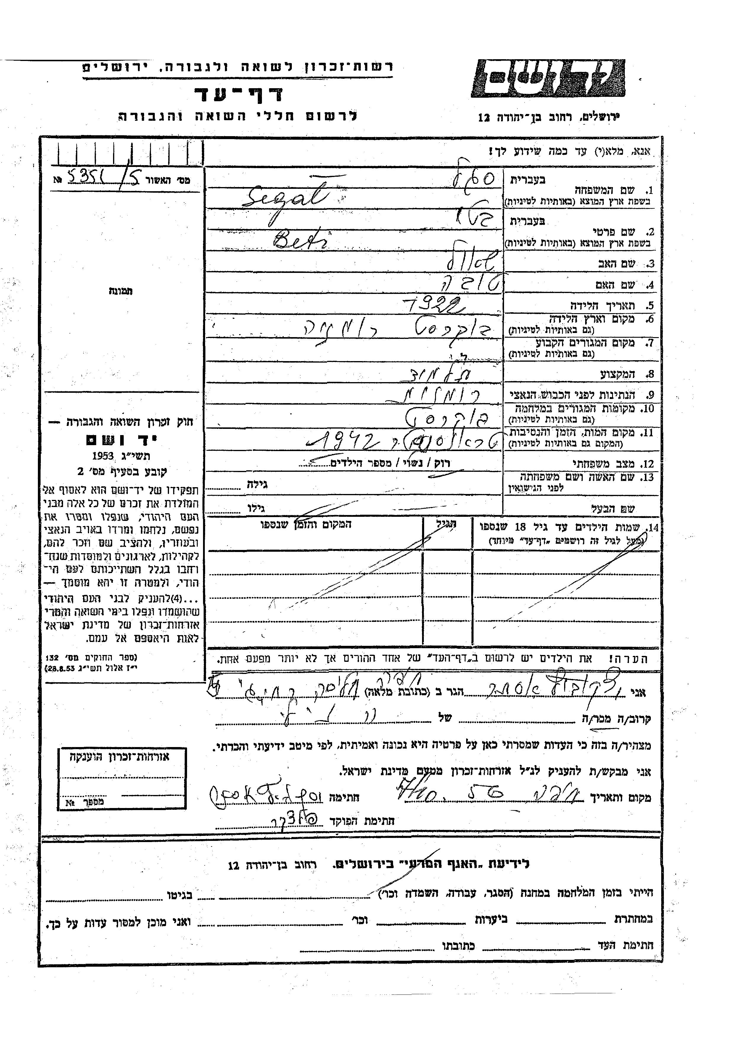 Segal Beti 1922 Bucuresti, Roumanie Feuille de témoignage