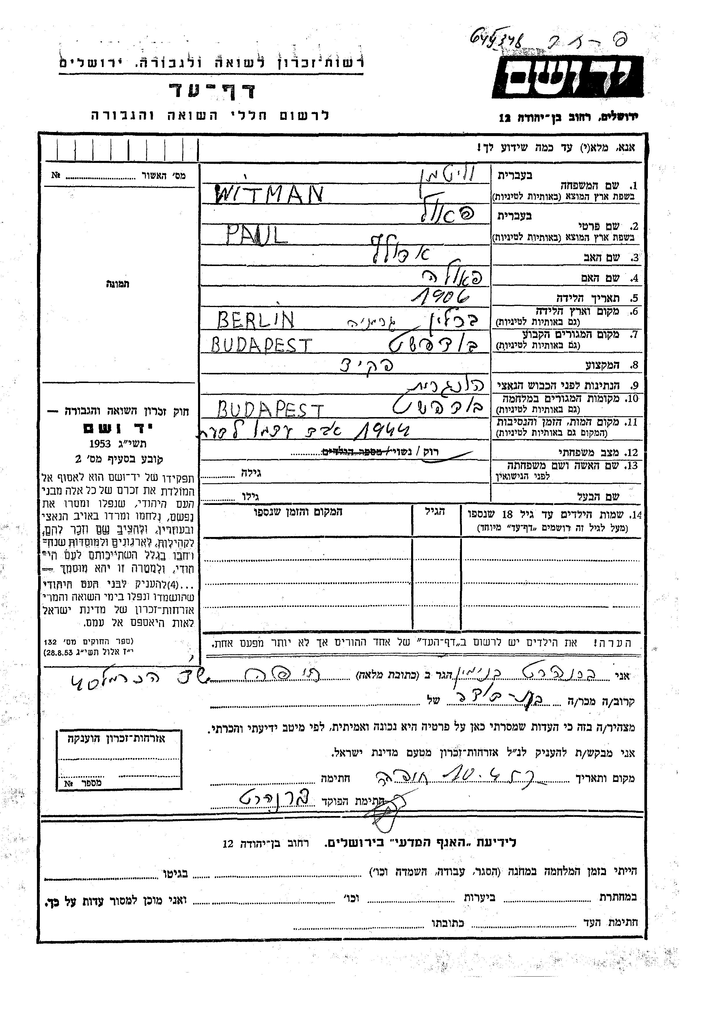 Paul Witman est né à Berlin, Allemagne en 1906, fils de Adolf et de Paula. Il était Employé/e de bureau et Célibataire. Avant la seconde guerre mondiale il vivait à Budapest, Hongrie. Au cours de la guerre, il était à Budapest, Hongrie.