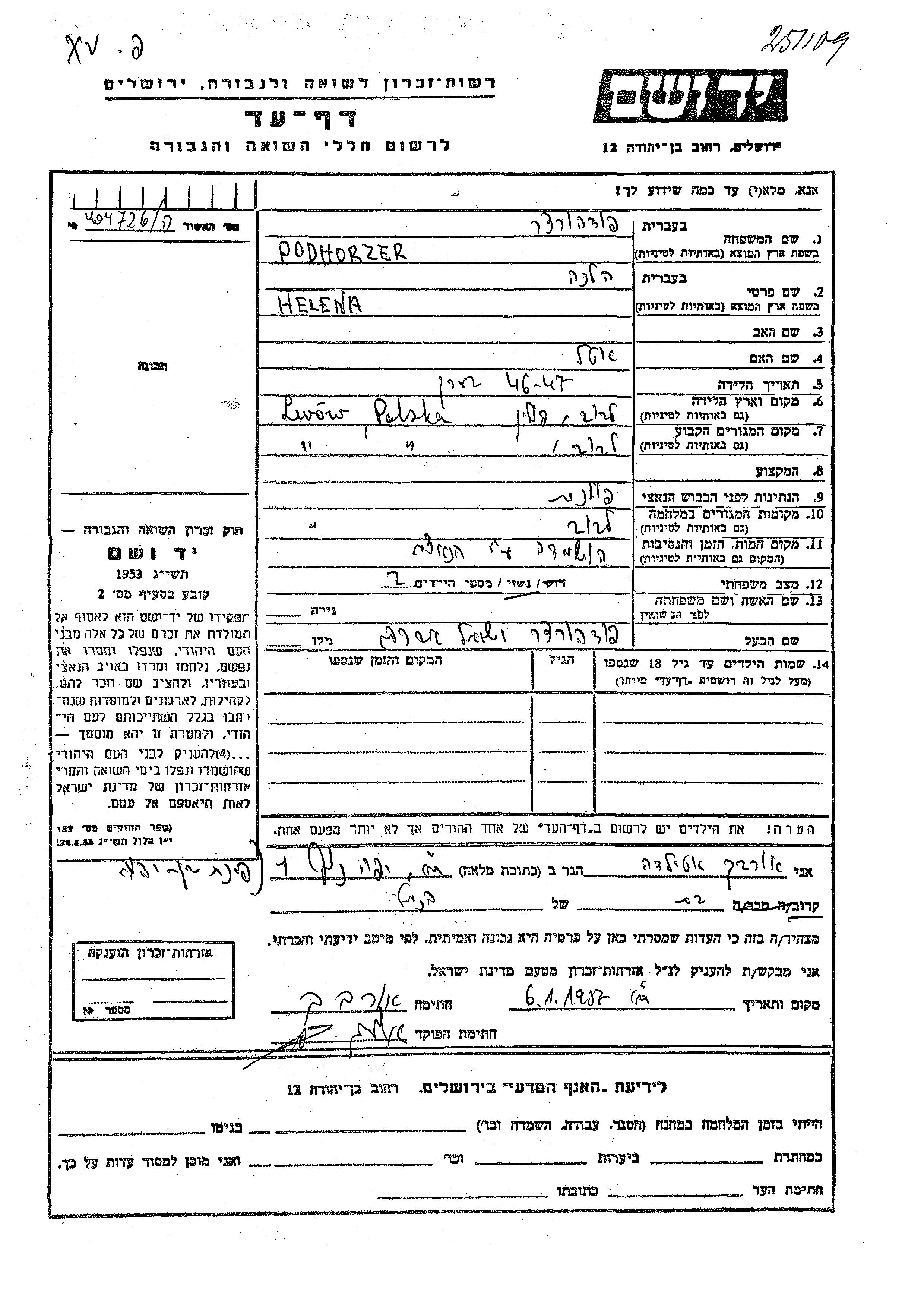 Podhorzer Helena Lwow, Pologne Feuille de témoignage