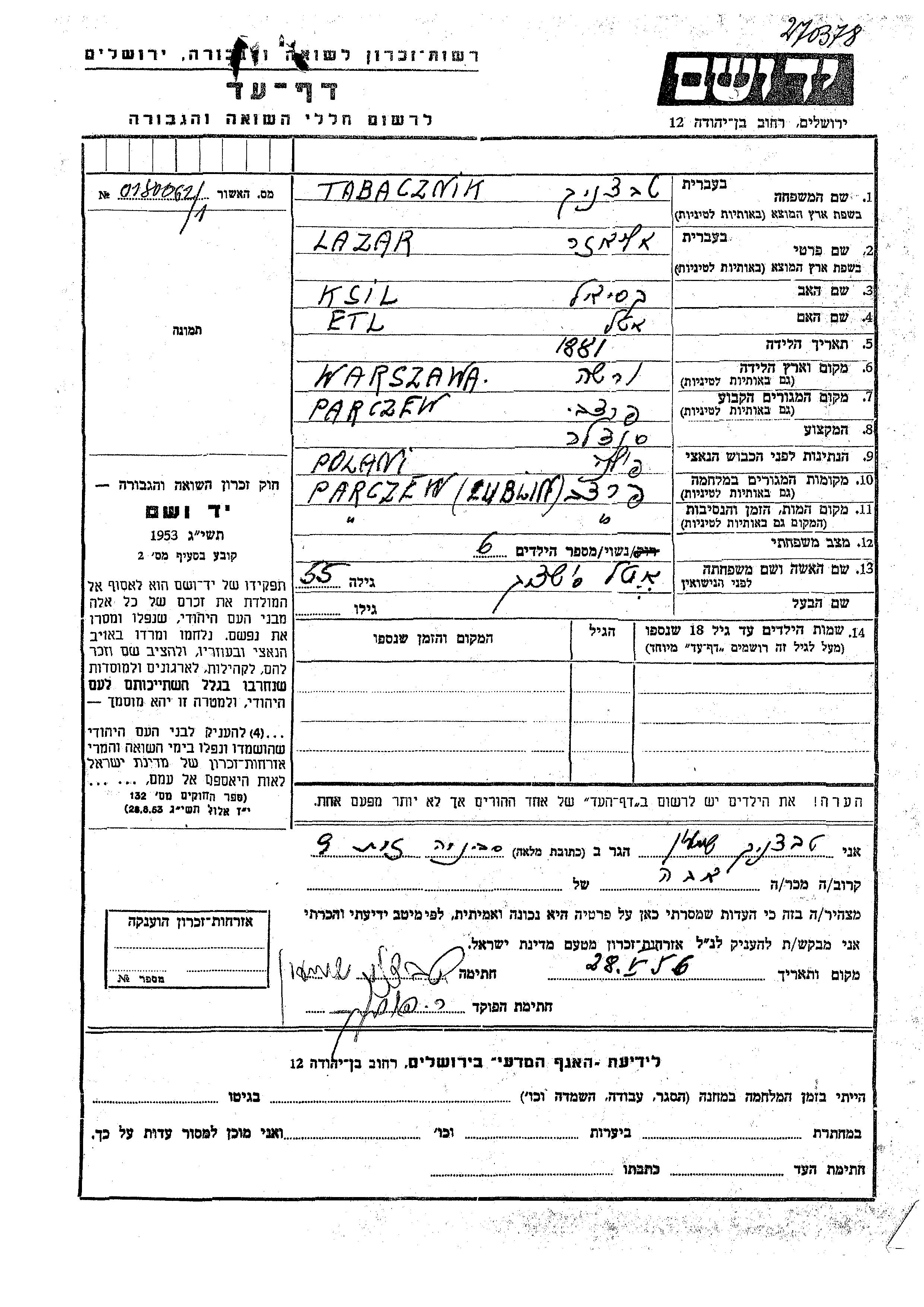 Lazar Tabacznik est né à Warszawa, Pologne en 1881, fils de Ksil et de Etl. Il était Cordonnier et Mariée à Etel née Sushchik. Avant la seconde guerre mondiale il vivait à Parczew, Pologne. Au cours de la guerre, il était à Parczew, Pologne.