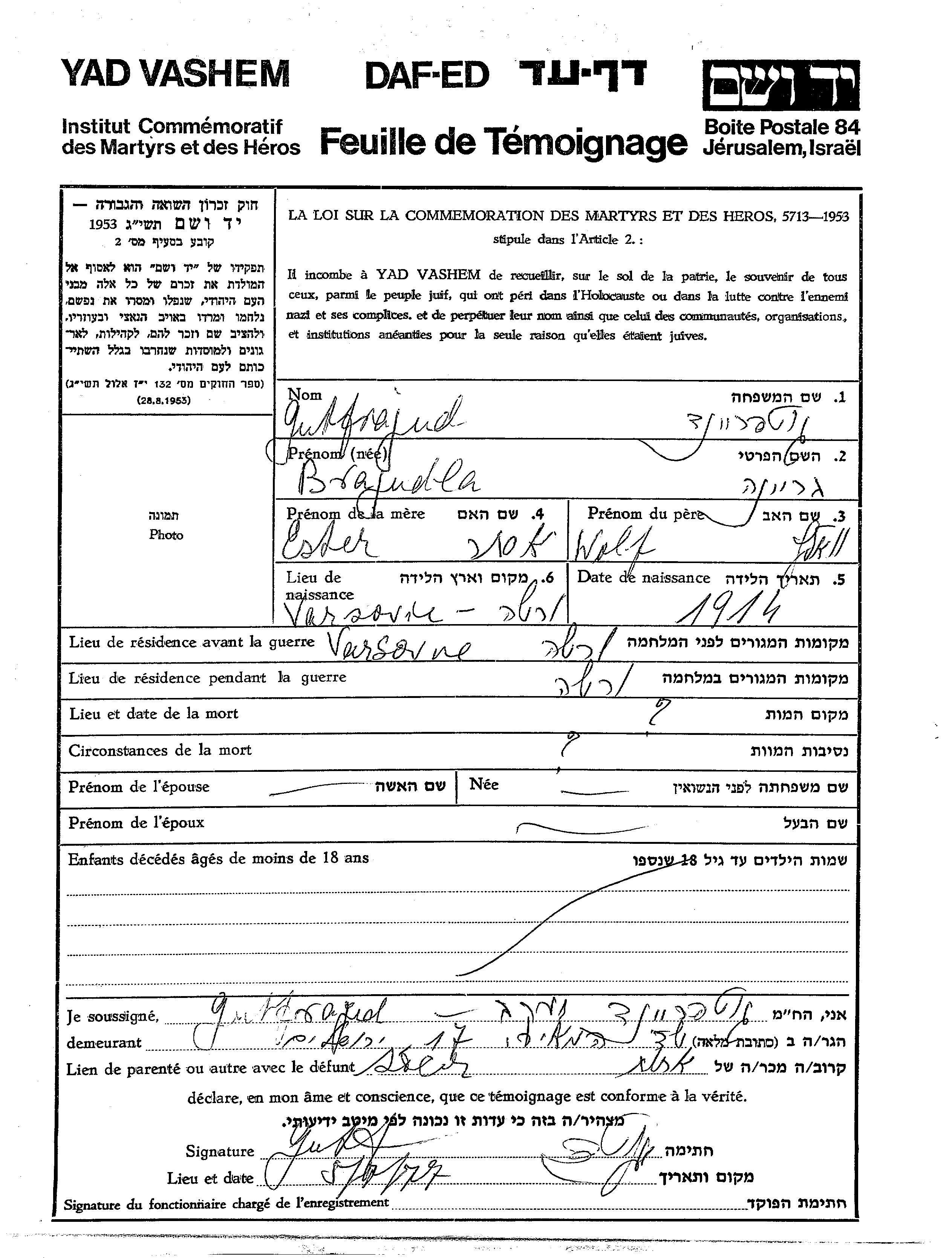 Gutfrajnd Brajndla 1914 Warsaw, Pologne Feuille de témoignage