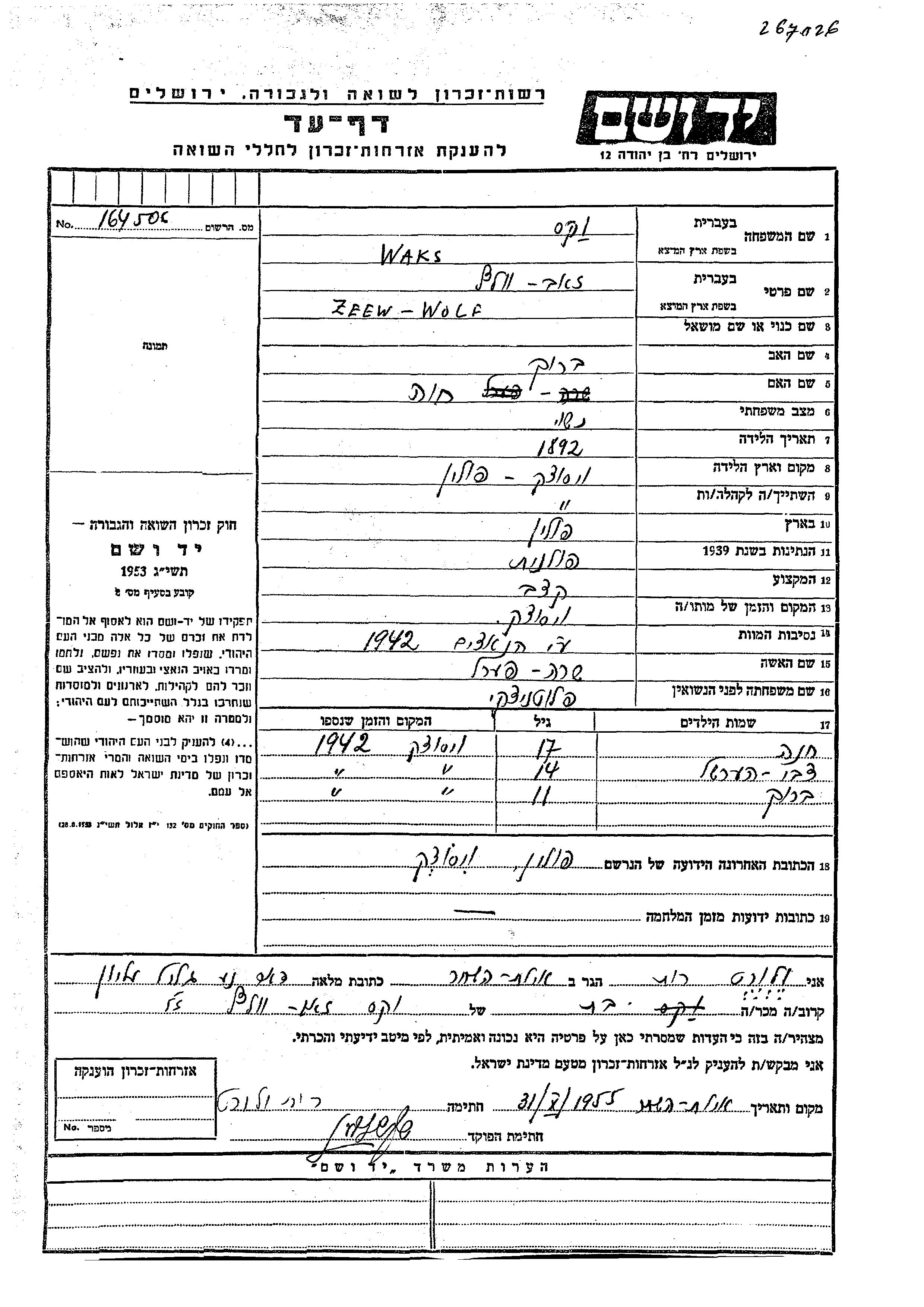 Zeew Wolf Waks est né à Wysock, Pologne en 1892, fils de Barukh et de Khava. Il était Boucher et Mariée à Sara Perl née Plotnitzki. Avant la seconde guerre mondiale il vivait à Wysock, Pologne.