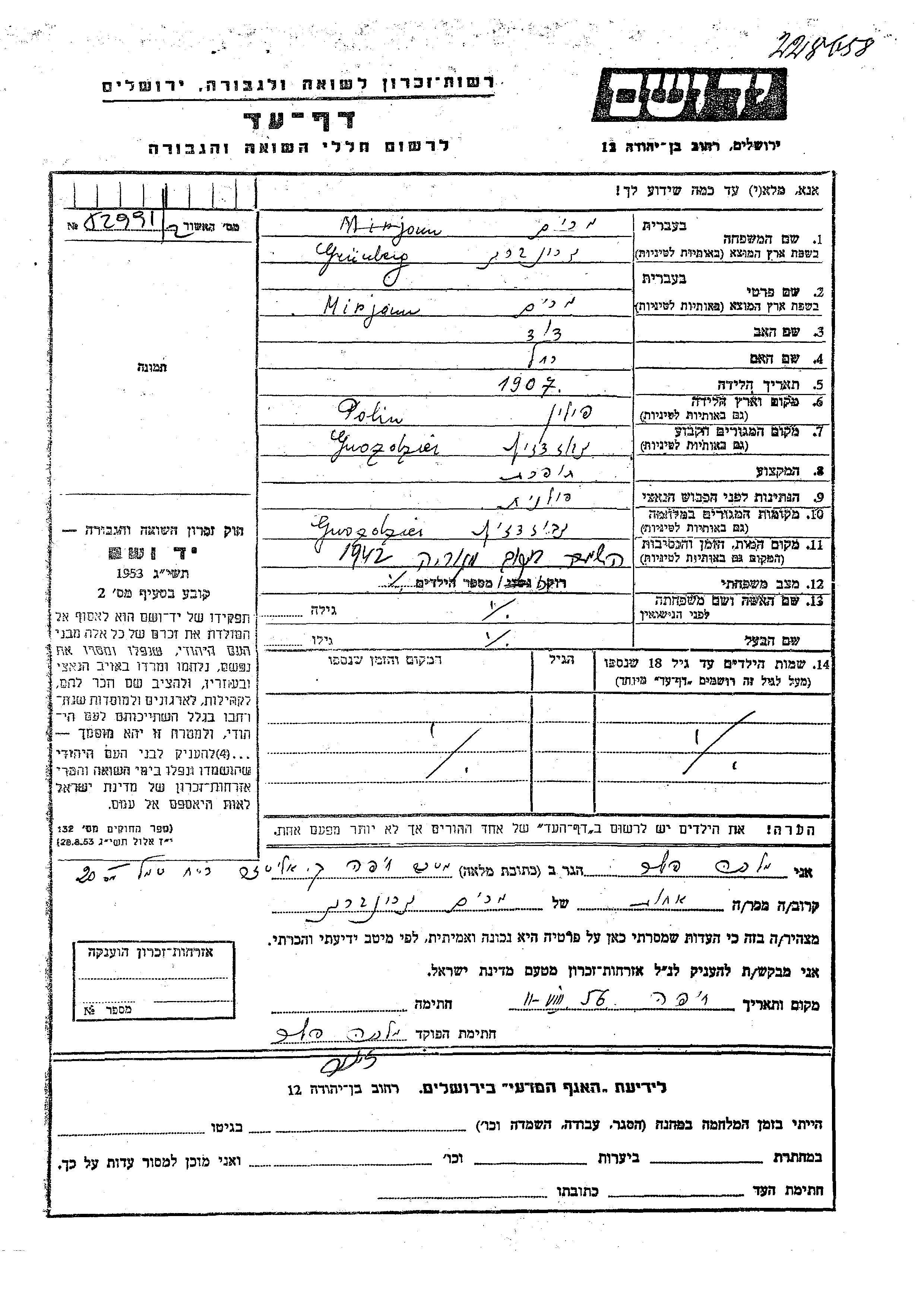 Grunberg Mirjam 1907 Gwozdziec, Pologne Feuille de témoignage
