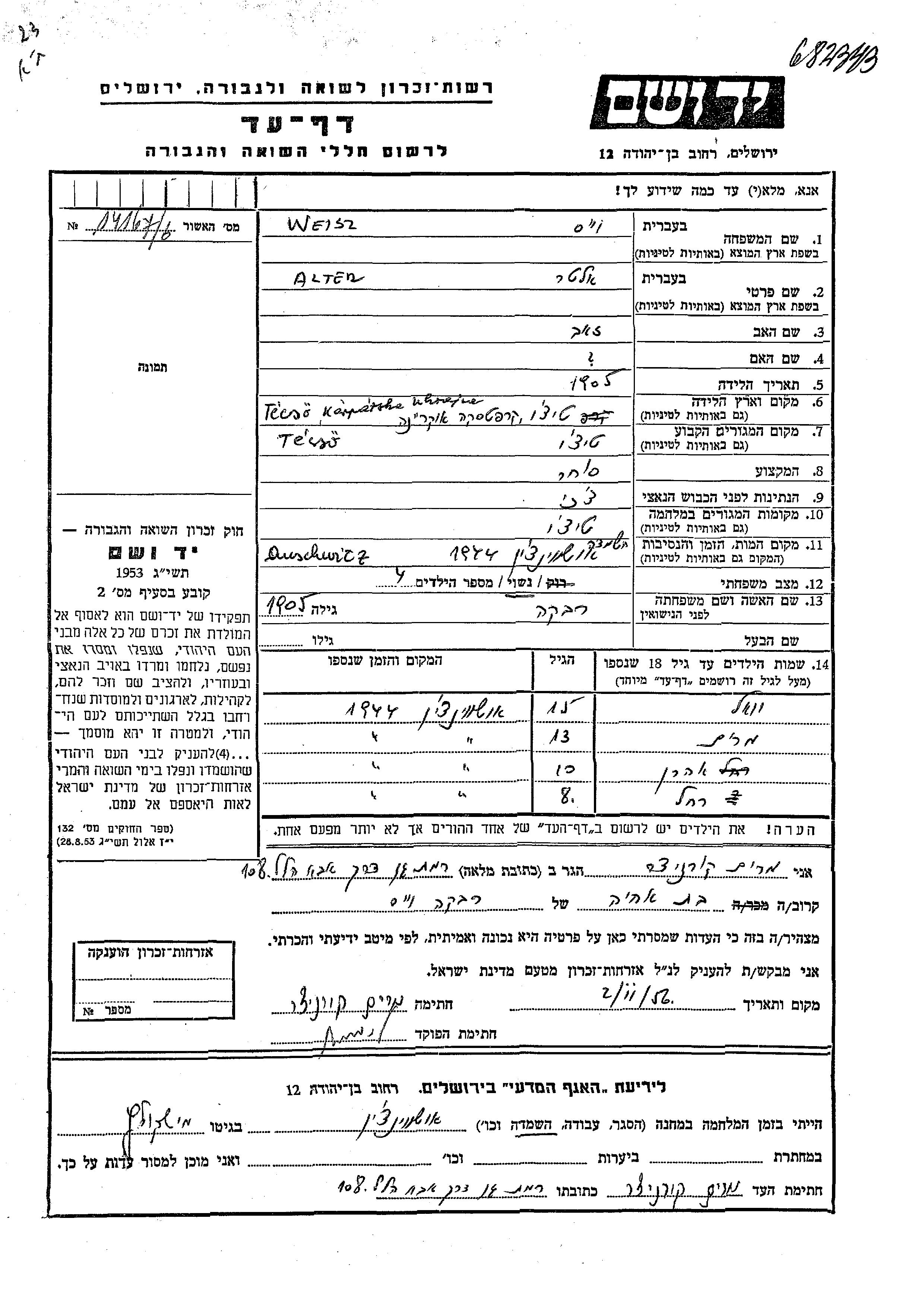 Weisz Alter 1905 Tece, Tchécoslovaquie Feuille de témoignage