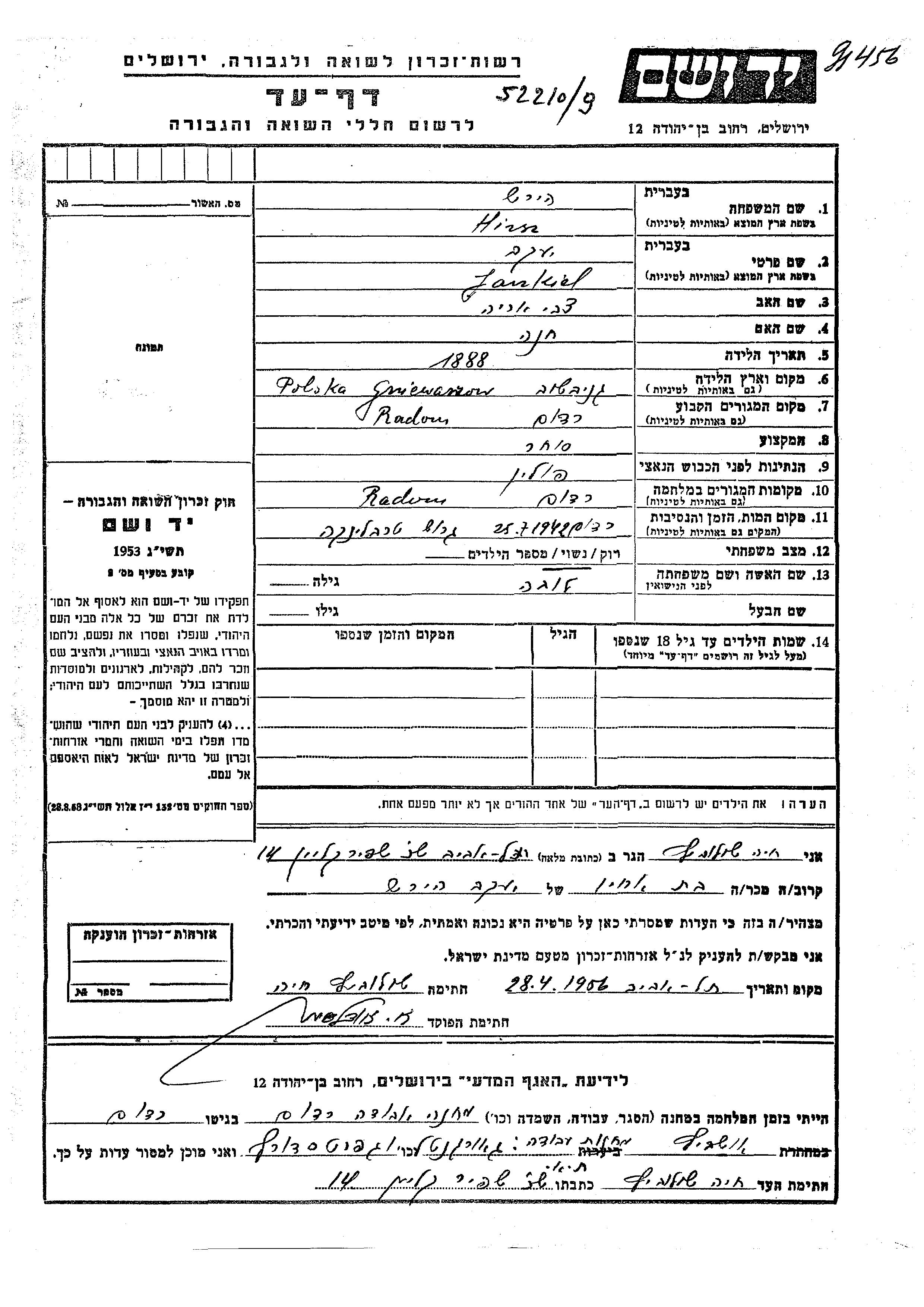 Hirsz Jakob 1888 Radom, Pologne Feuille de témoignage