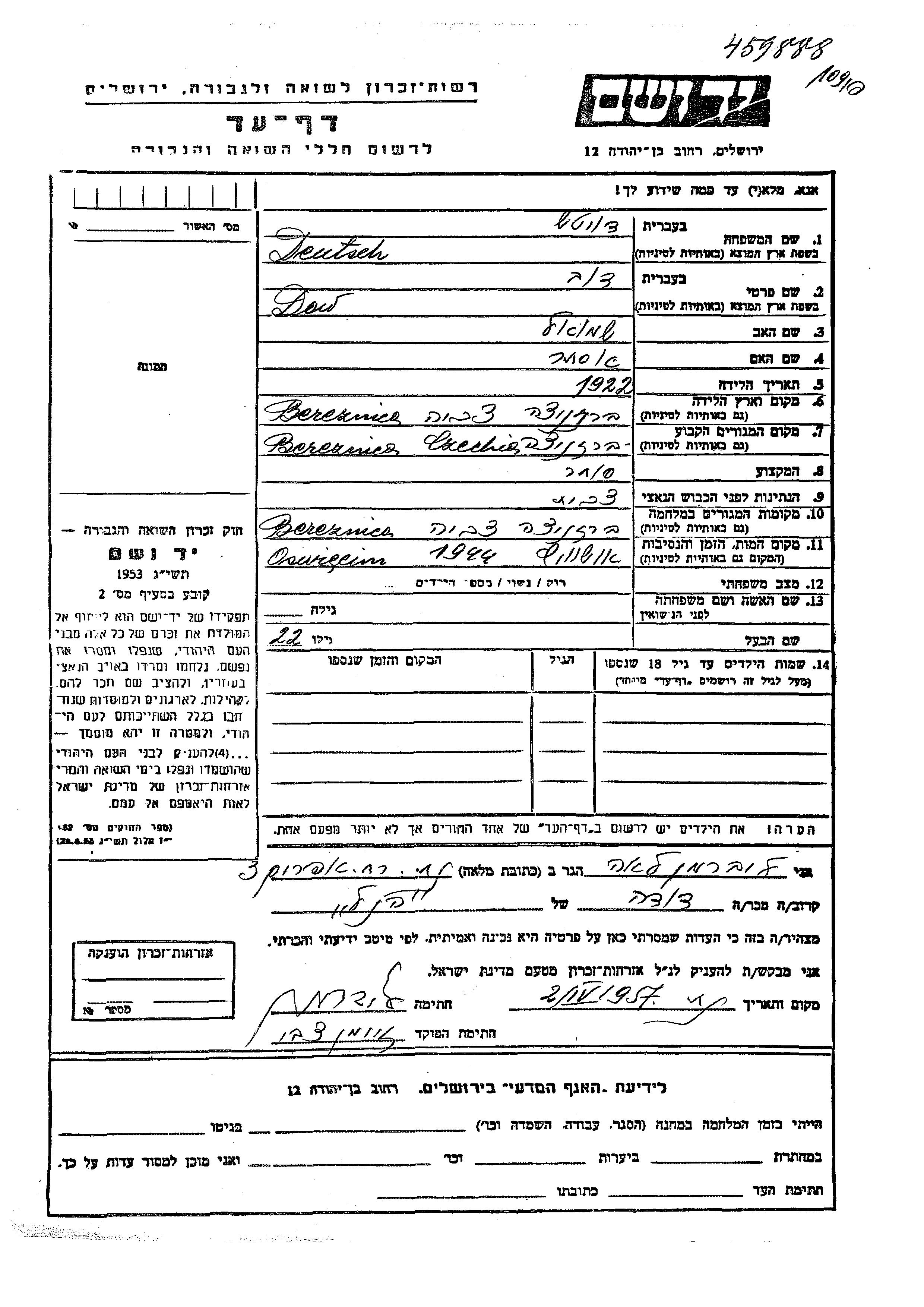 Dow Deutsch est né à Breznica, Tchécoslovaquie en 1922, fils de Shmuel et de Ester. Il était Commerçant/e. Avant la seconde guerre mondiale il vivait à Breznica, Tchécoslovaquie. Au cours de la guerre, il était à Breznica, Tchécoslovaquie.