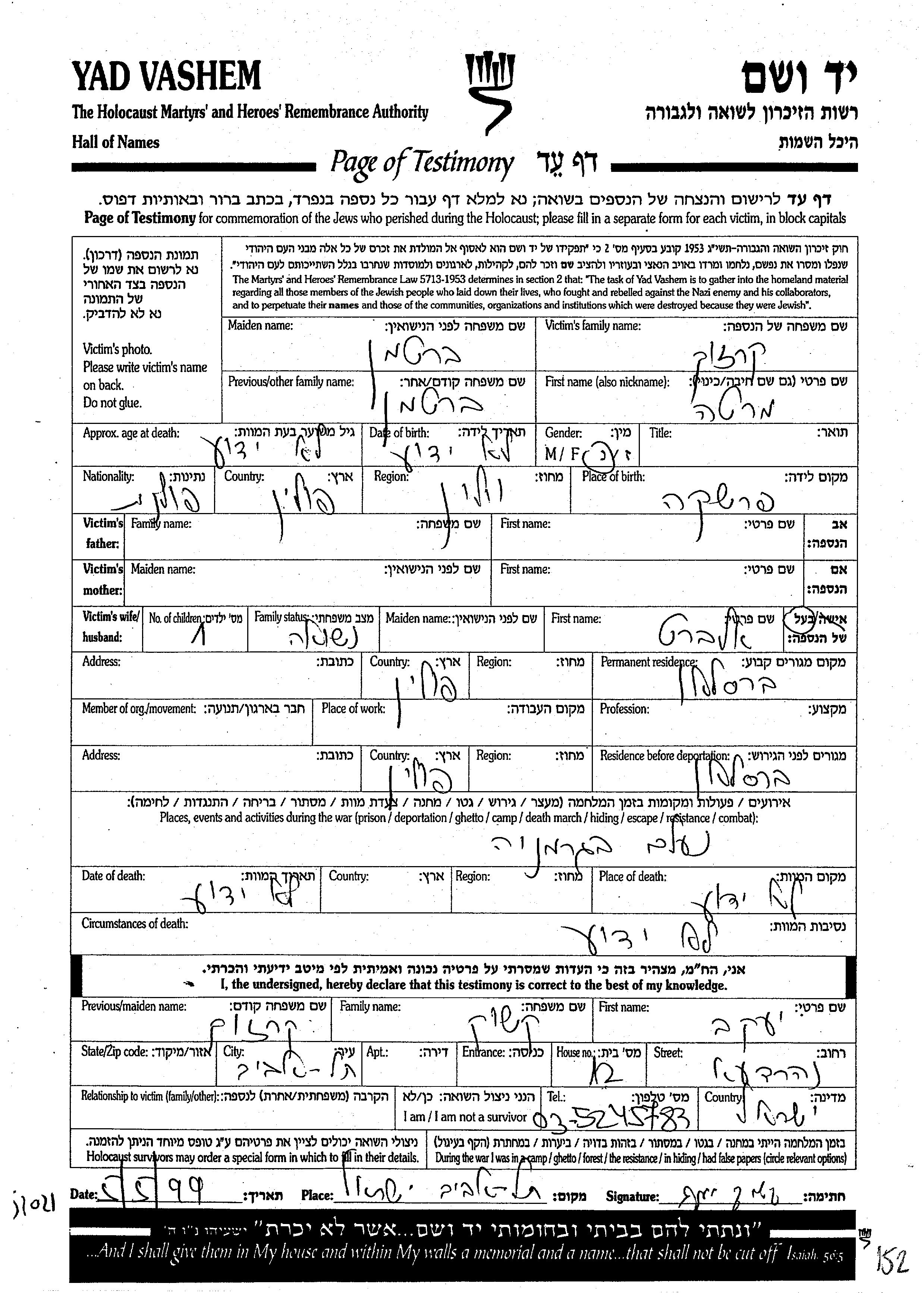 Yad Vashem - Pages of Testimony Names Memorial Collection