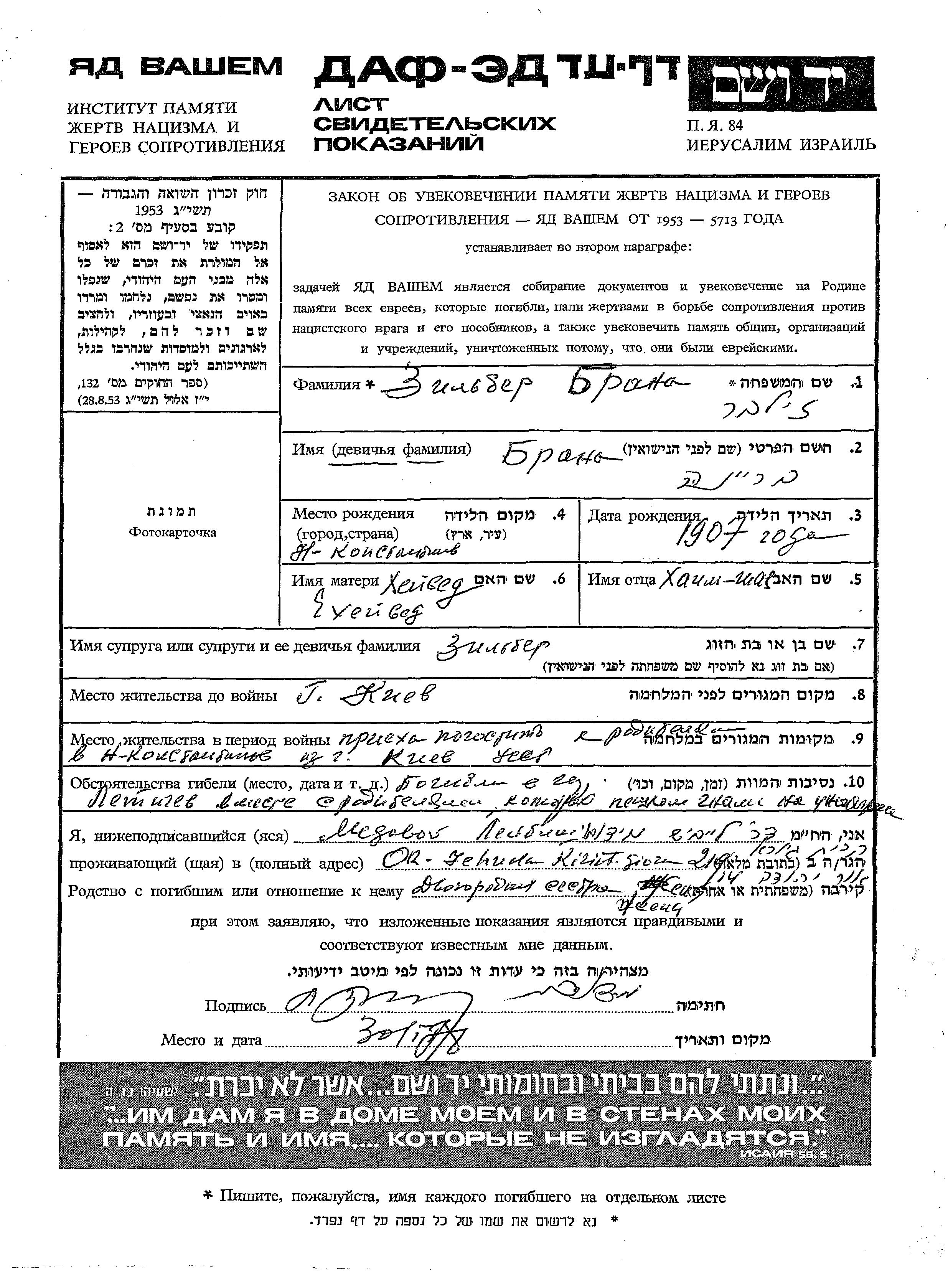 Zilber Brana 1907 Kiev, Ukraine (URSS) Feuille de témoignage
