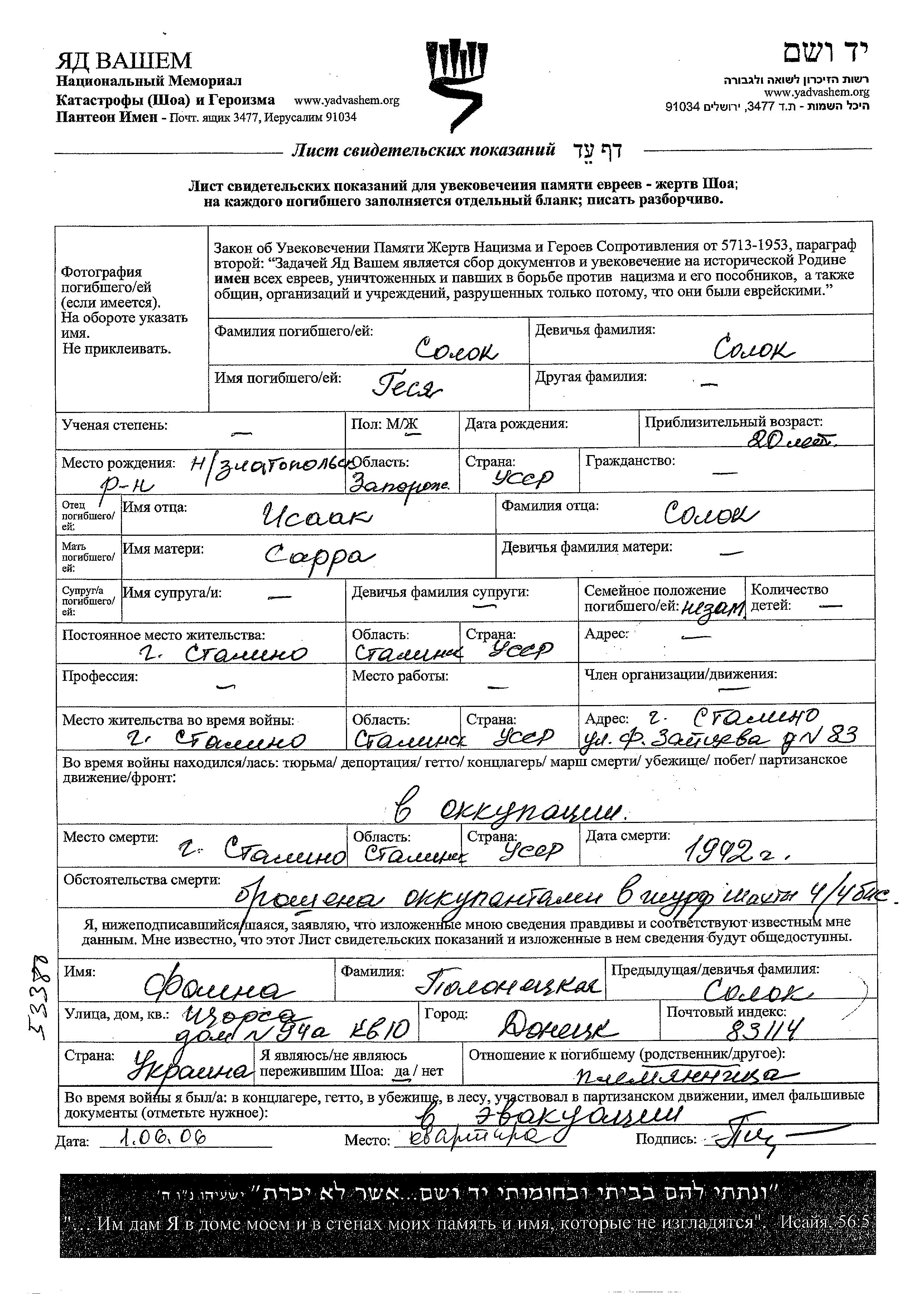 Yad Vashem - Pages of Testimony Names Memorial Collection