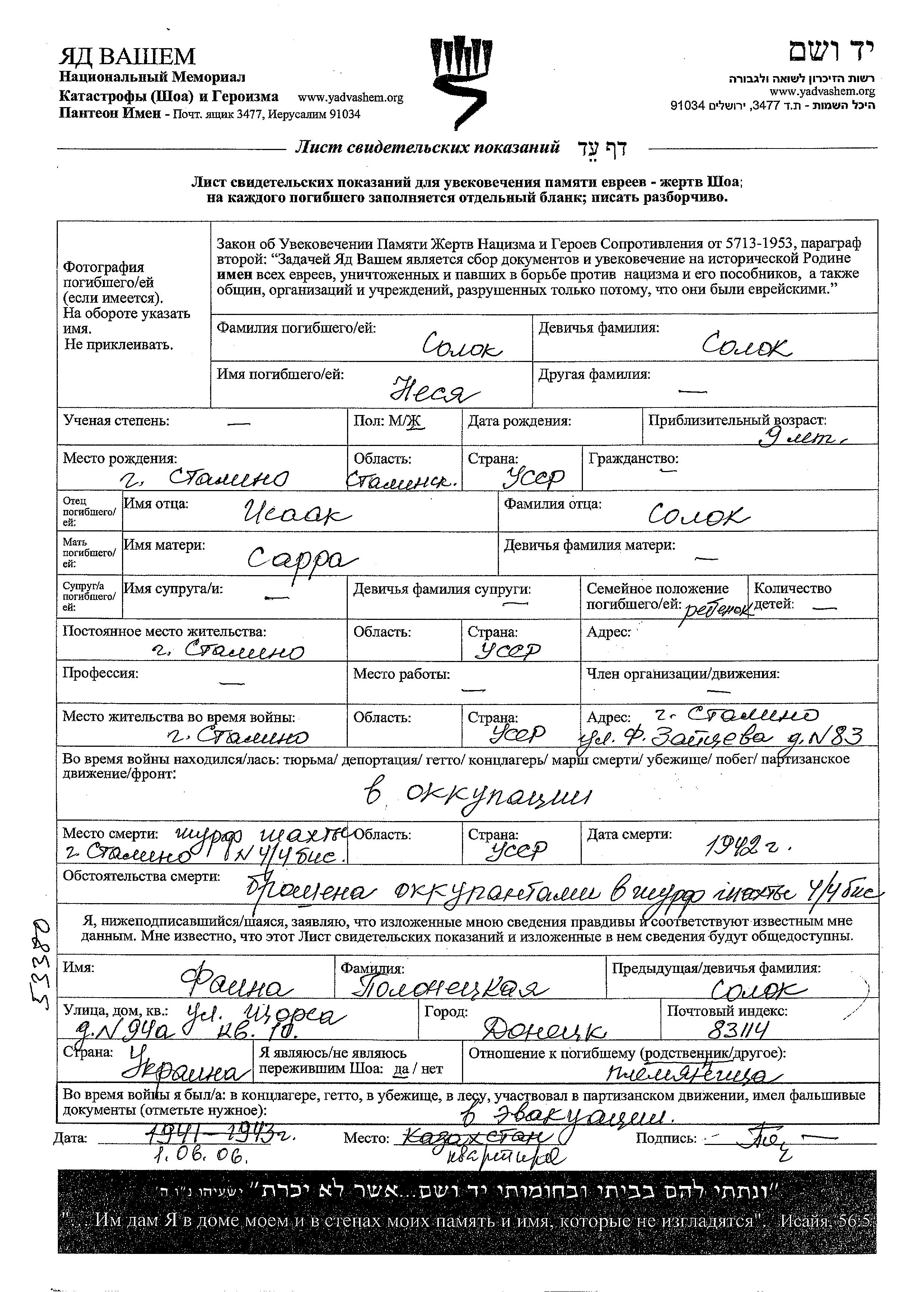 Nesya Solok est née à Stalino, Ukraine (URSS), fille de Isaak et de Sarra. Elle était Enfant. Avant la seconde guerre mondiale elle vivait à Stalino, Ukraine (URSS). Pendant la guerre, elle était à Stalino, Ukraine (URSS).