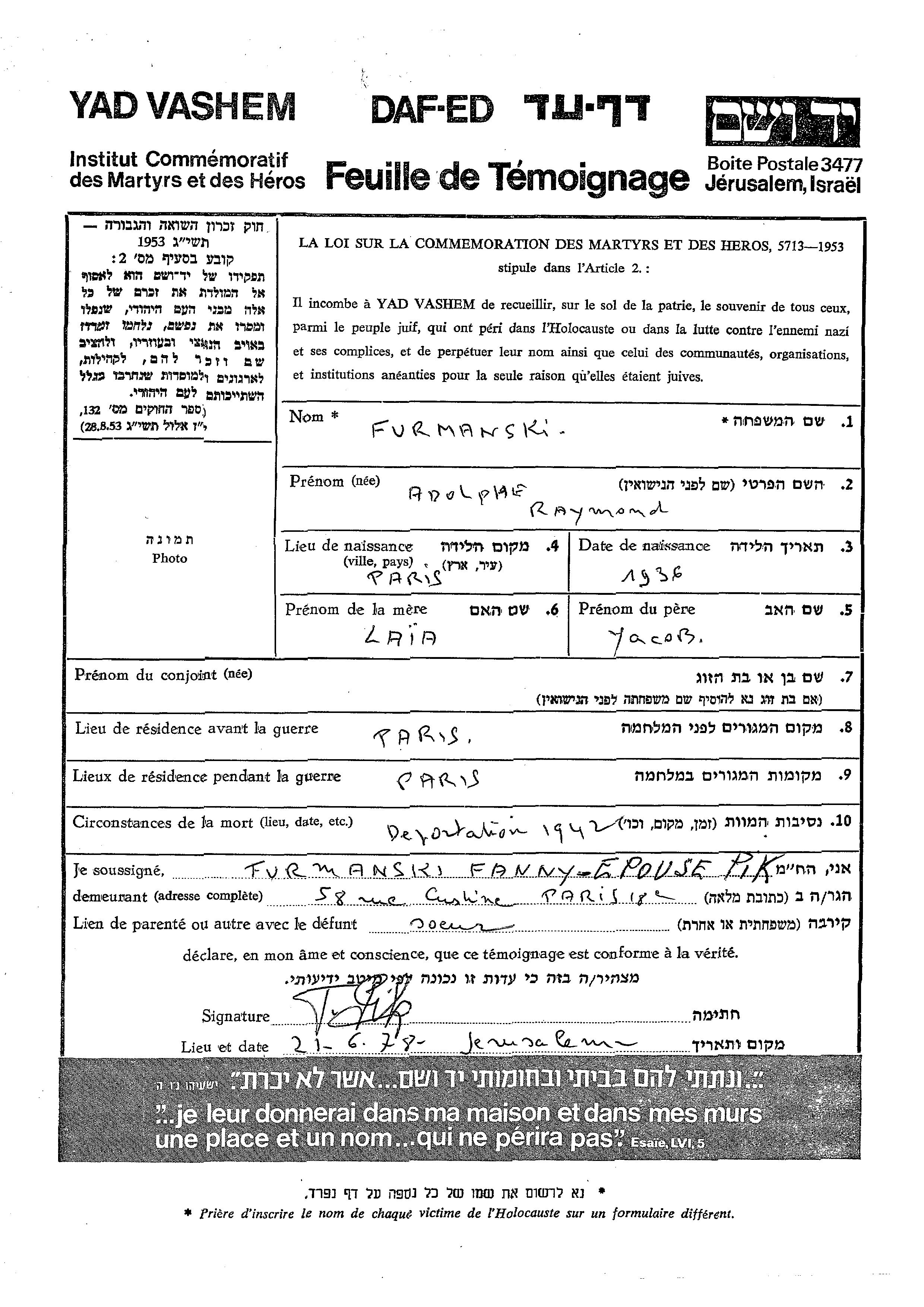 Adolphe Raymond Furmanski est né à Paris, France en 1936, fils de Jacob et de Laia. Avant la seconde guerre mondiale il vivait à Paris, France. Au cours de la guerre, il était à Paris, France.