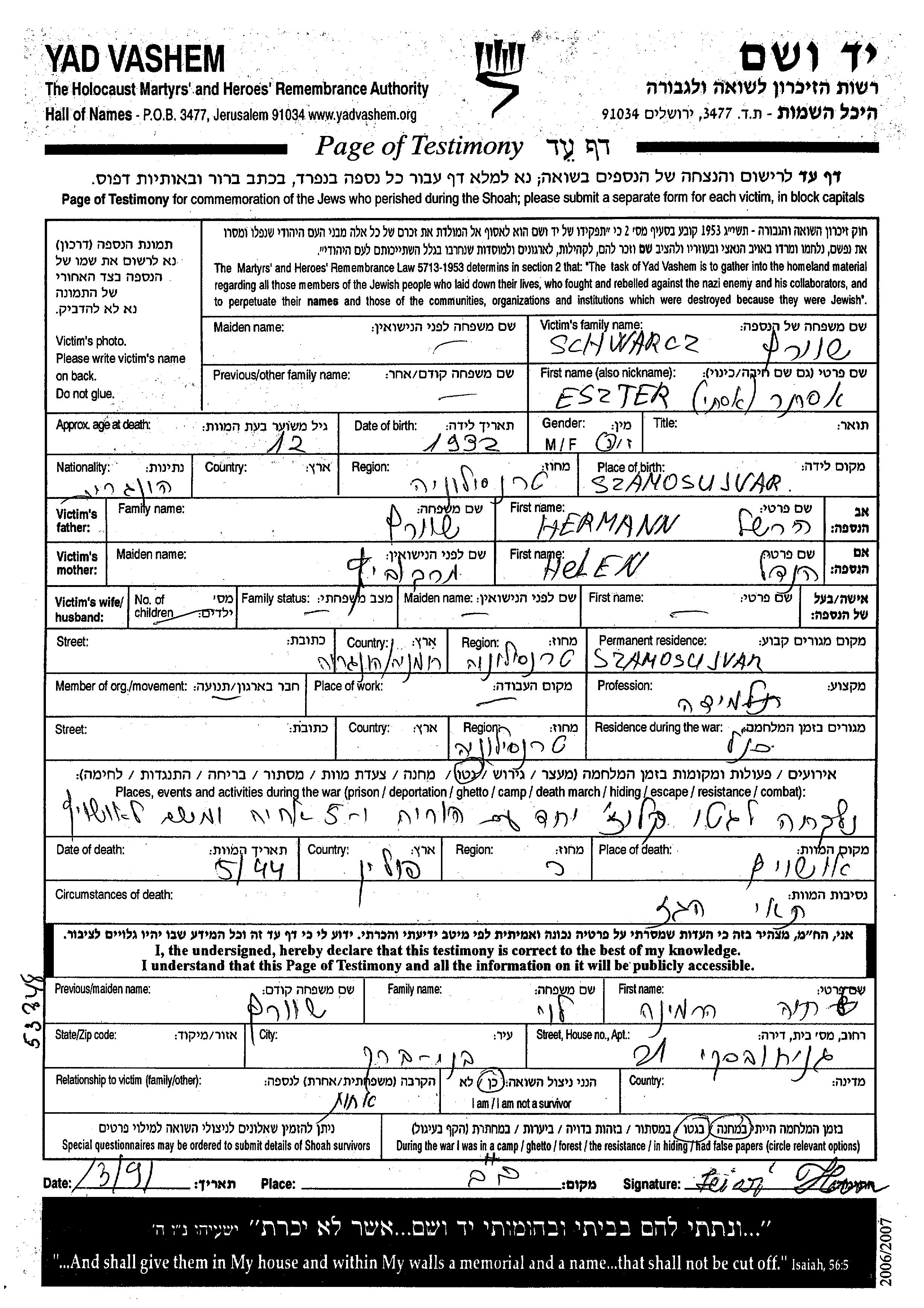 Shvartz Ester 1932 Szamosuivar, Roumanie Feuille de témoignage