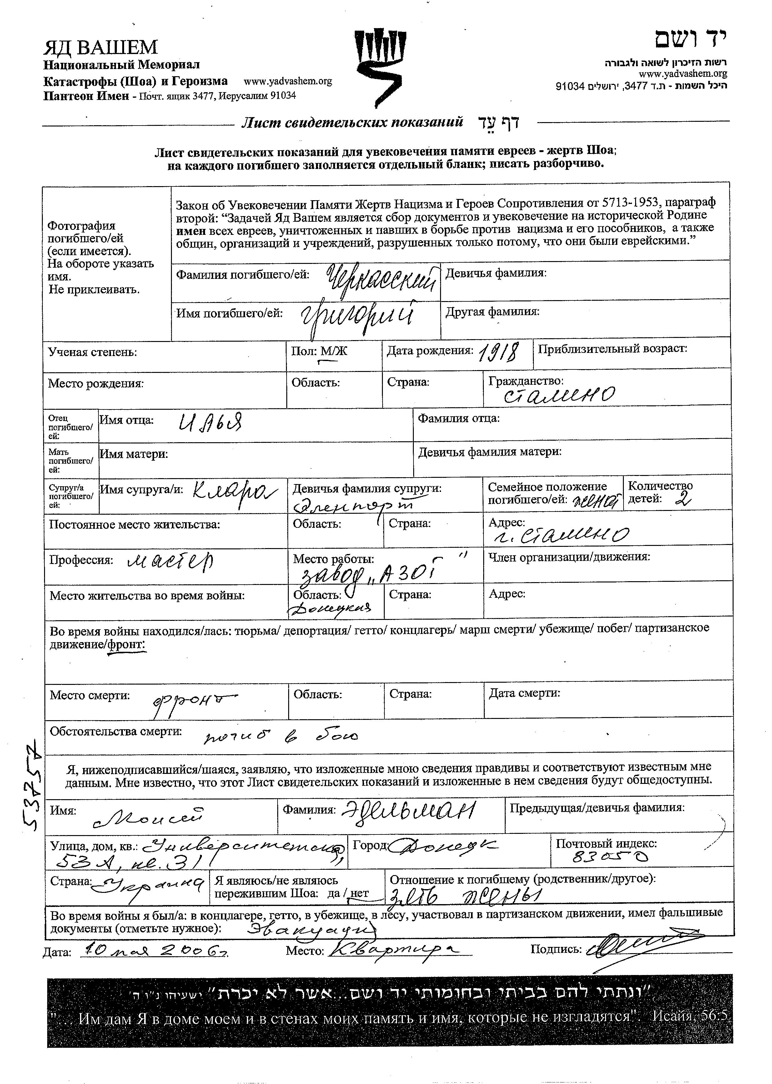 Grigoriy Cherkasskiy est né à Stalino, Ukraine (URSS) en 1918, fils de Ilya. Il était Chef d'équipe et Mariée à Klara née Elenport. Avant la seconde guerre mondiale il vivait à Stalino, Ukraine (URSS). Au cours de la guerre, il était à the Soviet armed forces. Grigoriy a été tué en tant que militaire pendant la Seconde Guerre mondiale.