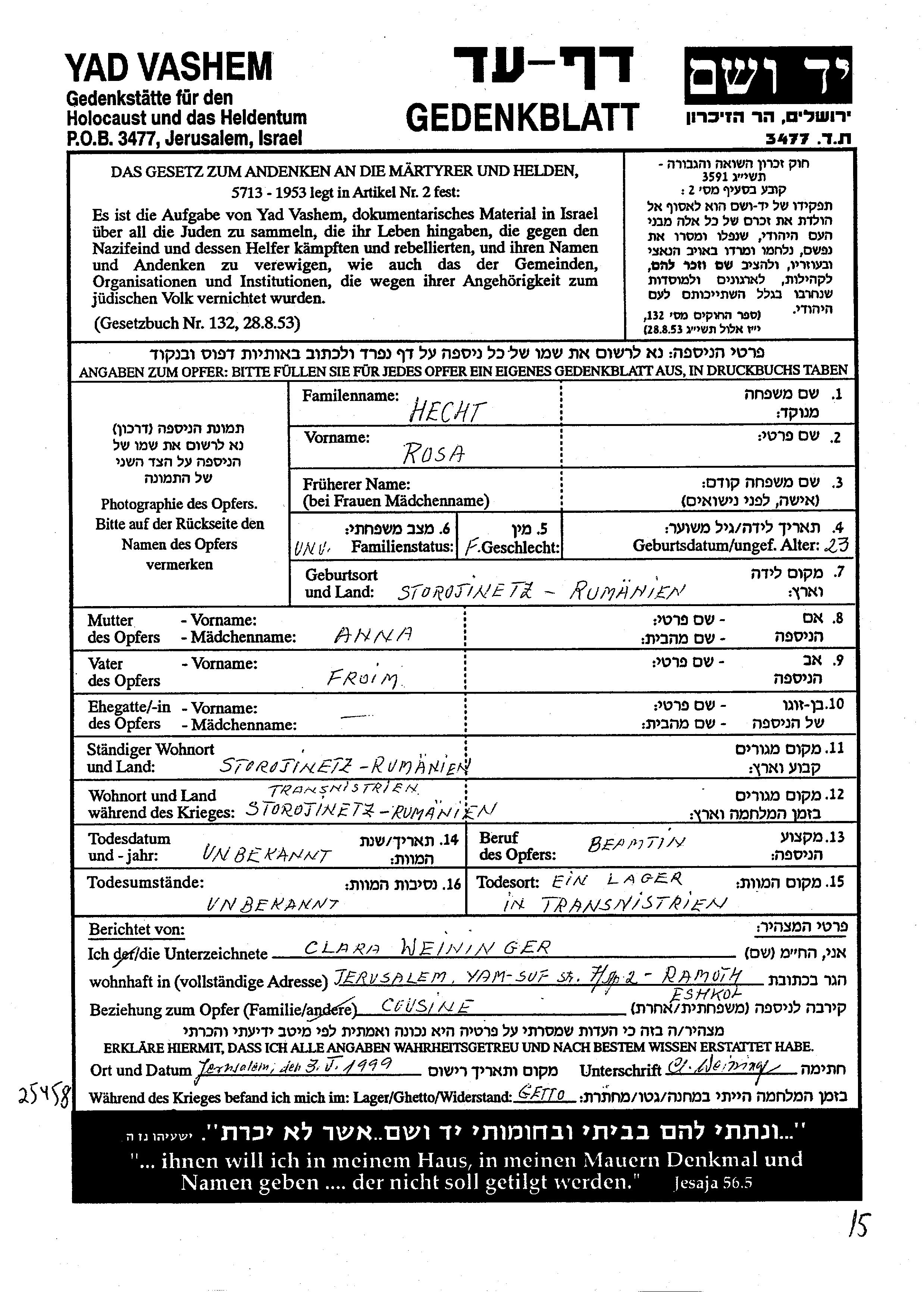 Hecht Rosa Storojinet, Roumanie Feuille de témoignage