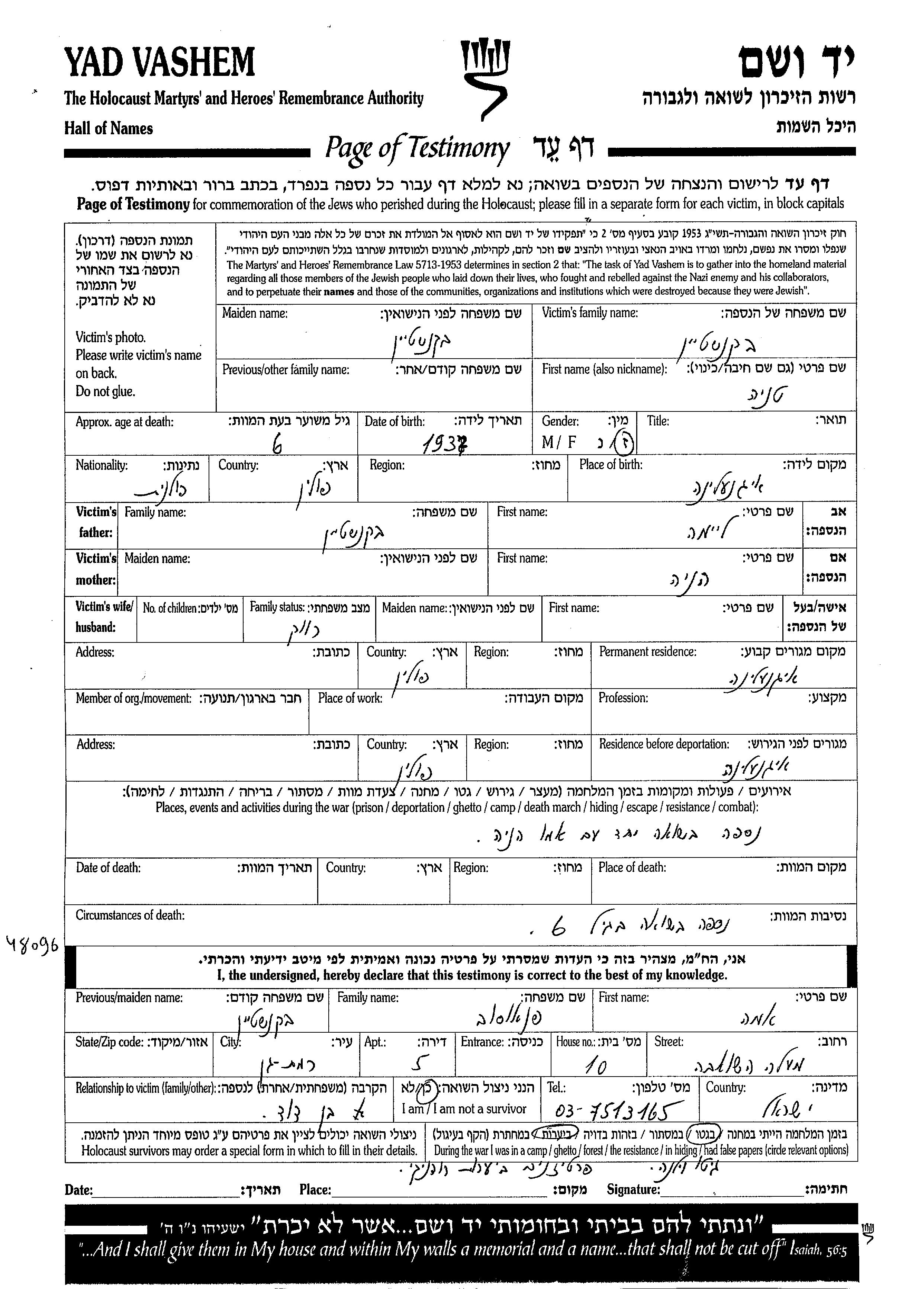 Yad Vashem - Pages of Testimony Names Memorial Collection