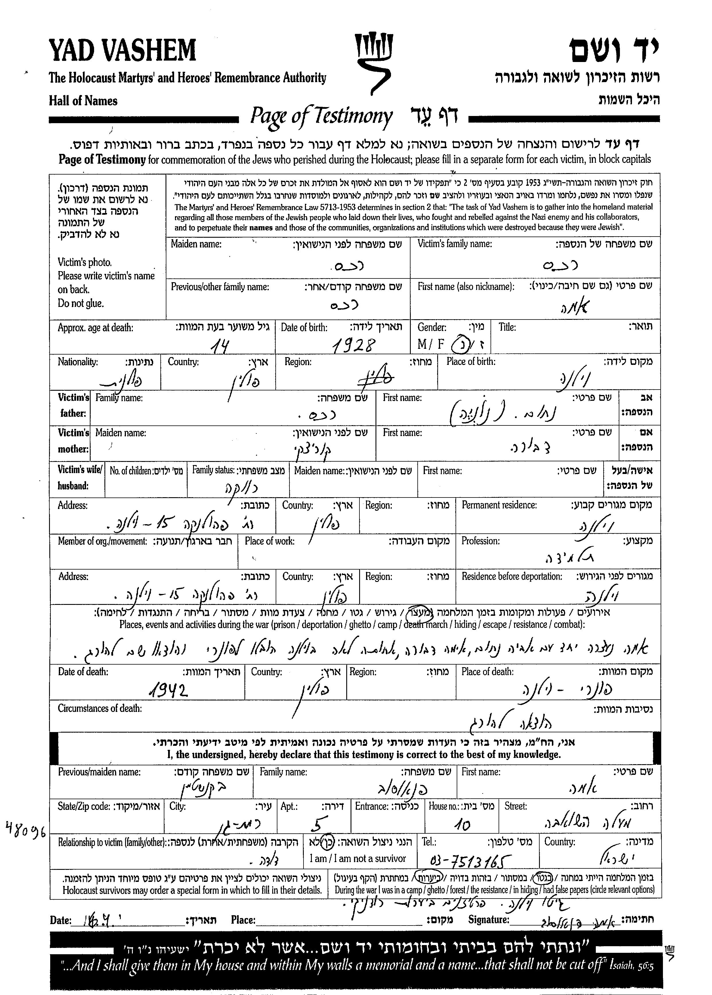 Yad Vashem - Pages of Testimony Names Memorial Collection