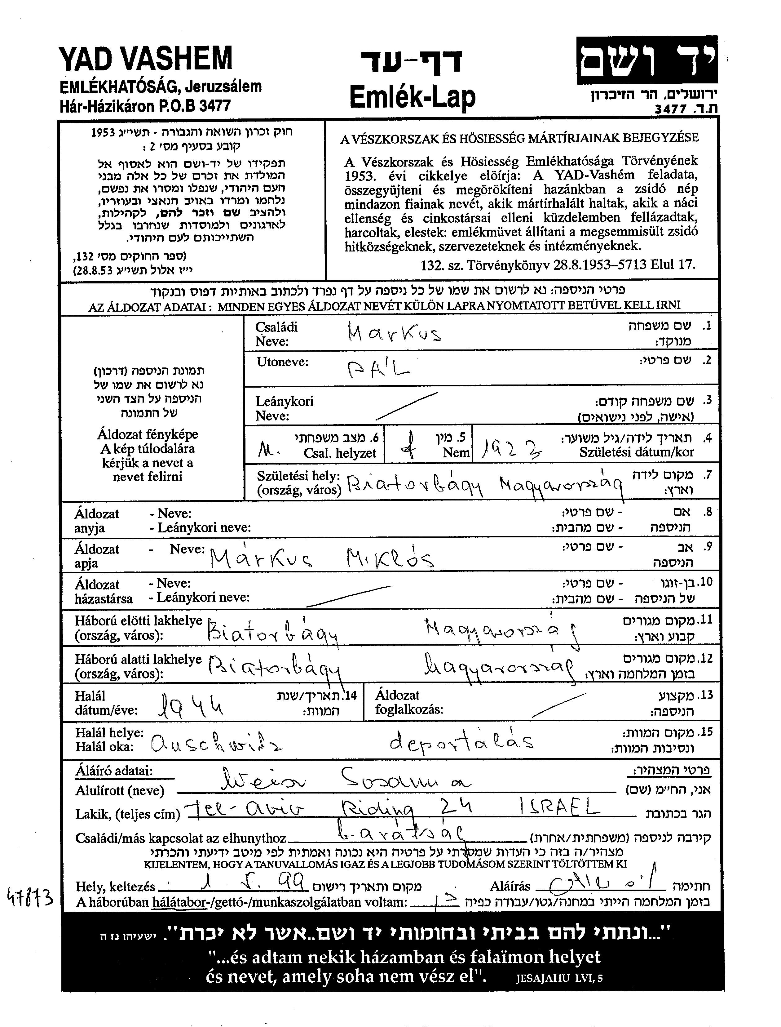 Pal Markus est né à Biatorbagy, Hongrie en 1923, fils de Miklos. Avant la seconde guerre mondiale il vivait à Biatorbagy, Hongrie. Au cours de la guerre, il était à Biatorbagy, Hongrie.