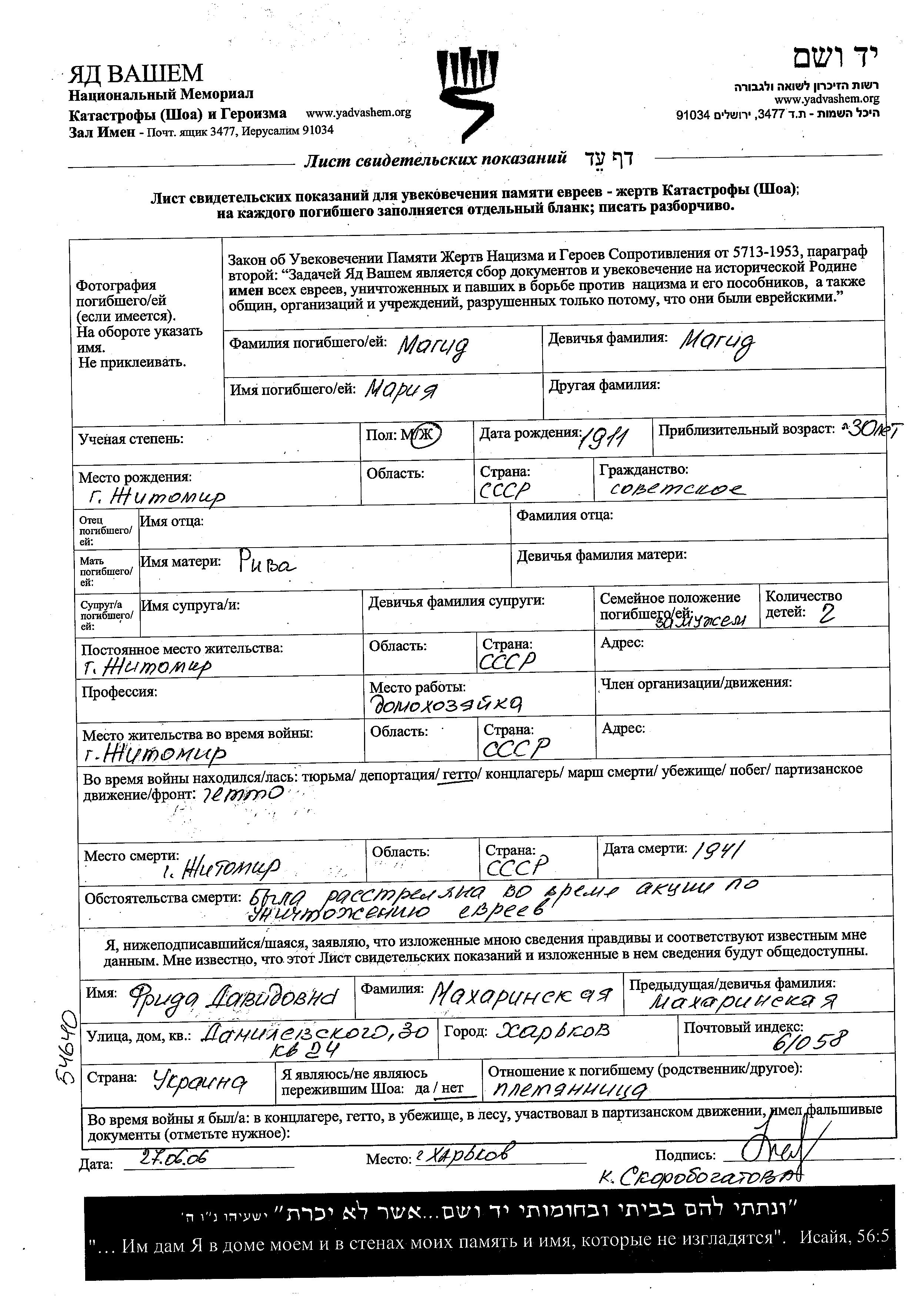 Magid Maria 1911 Zhitomir, Ukraine (URSS) Feuille de témoignage