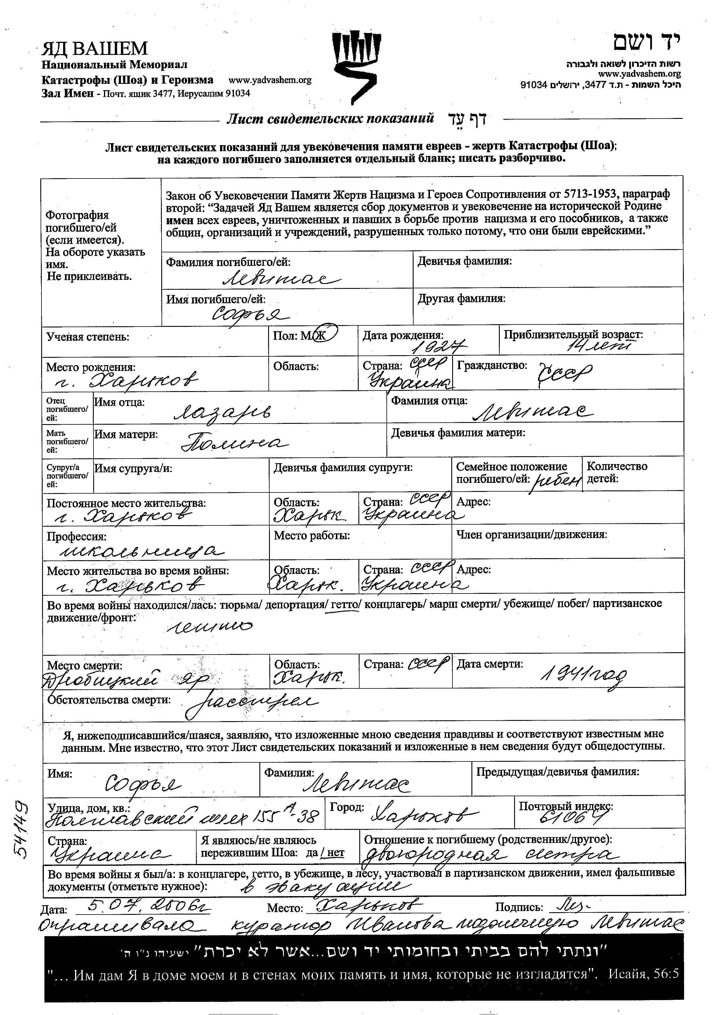 Yad Vashem - Pages of Testimony Names Memorial Collection